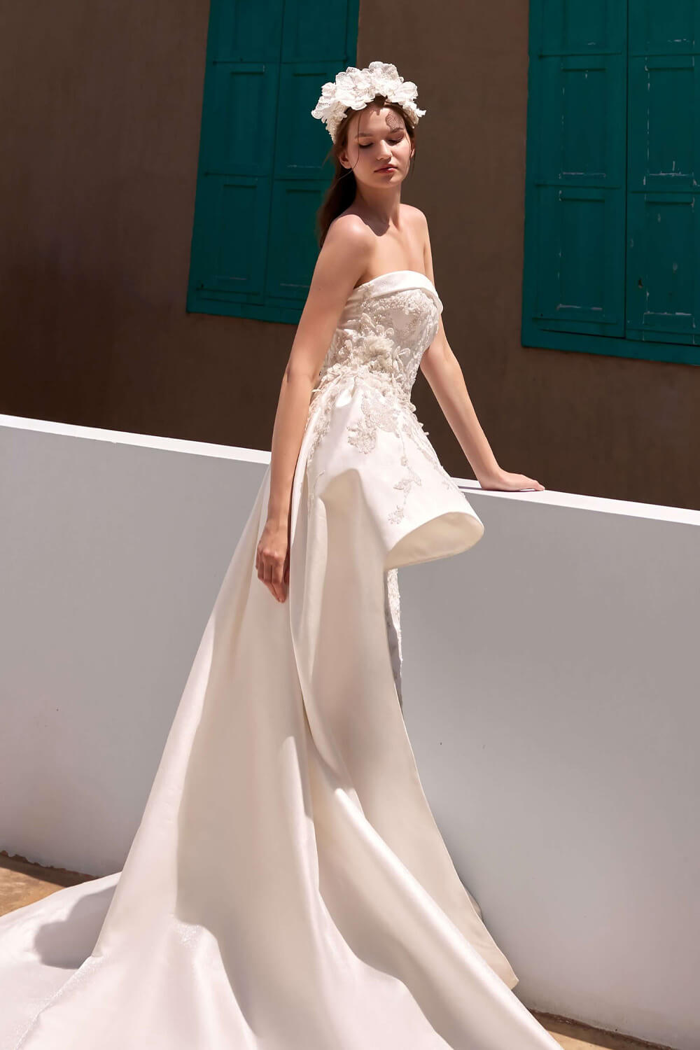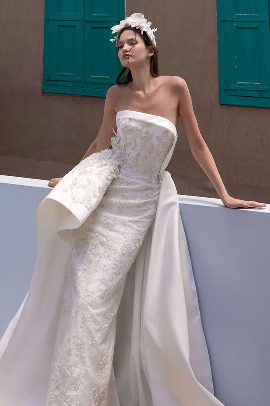 يجمع فستان أميلي بين الذوق الطليعي والأناقة الكلاسيكية. يتميزهذا الفستان الميكادو بتصميم أنيق وتنورة درامية متتالية. يضيف خط العنق المنظم، المزين بزخارف ثلاثية الأبعاد، لمسة منحوتة عصرية، مما يجعله خيارًا متميزًا للعرائس اللواتي يبحثن عن شيء غير عادي.