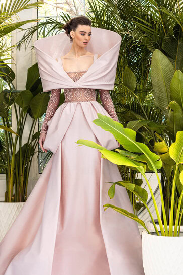يعكس هذا الفستان الوردي الأناقة الملكية بتصميمه الهندسي المستوحى من أنماط النسيج التقليدي. تعكس التطريزات اللؤلؤية فن الحرف البدوية، بينما يضفي التصميم المكشوف والطيات النحتية لمسة جريئة ومتألقة تمزج بين التراث والرقي العصري.