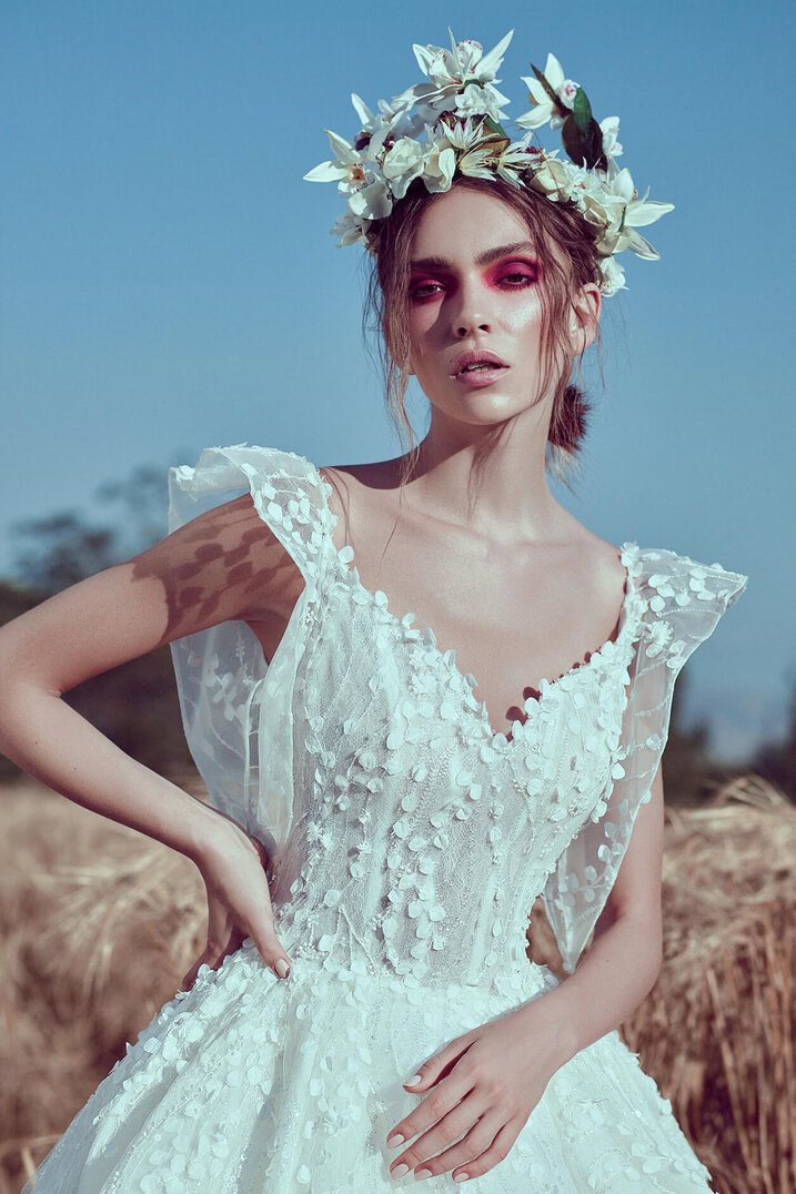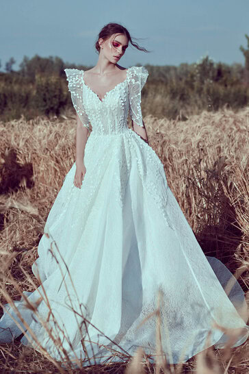 فستان زفاف طويل مزيّن ببتلات الزهور وأكمام كبيرة متمايلة، تعبّر عن الرومانسية بالطريقة الأكثر أناقةً.