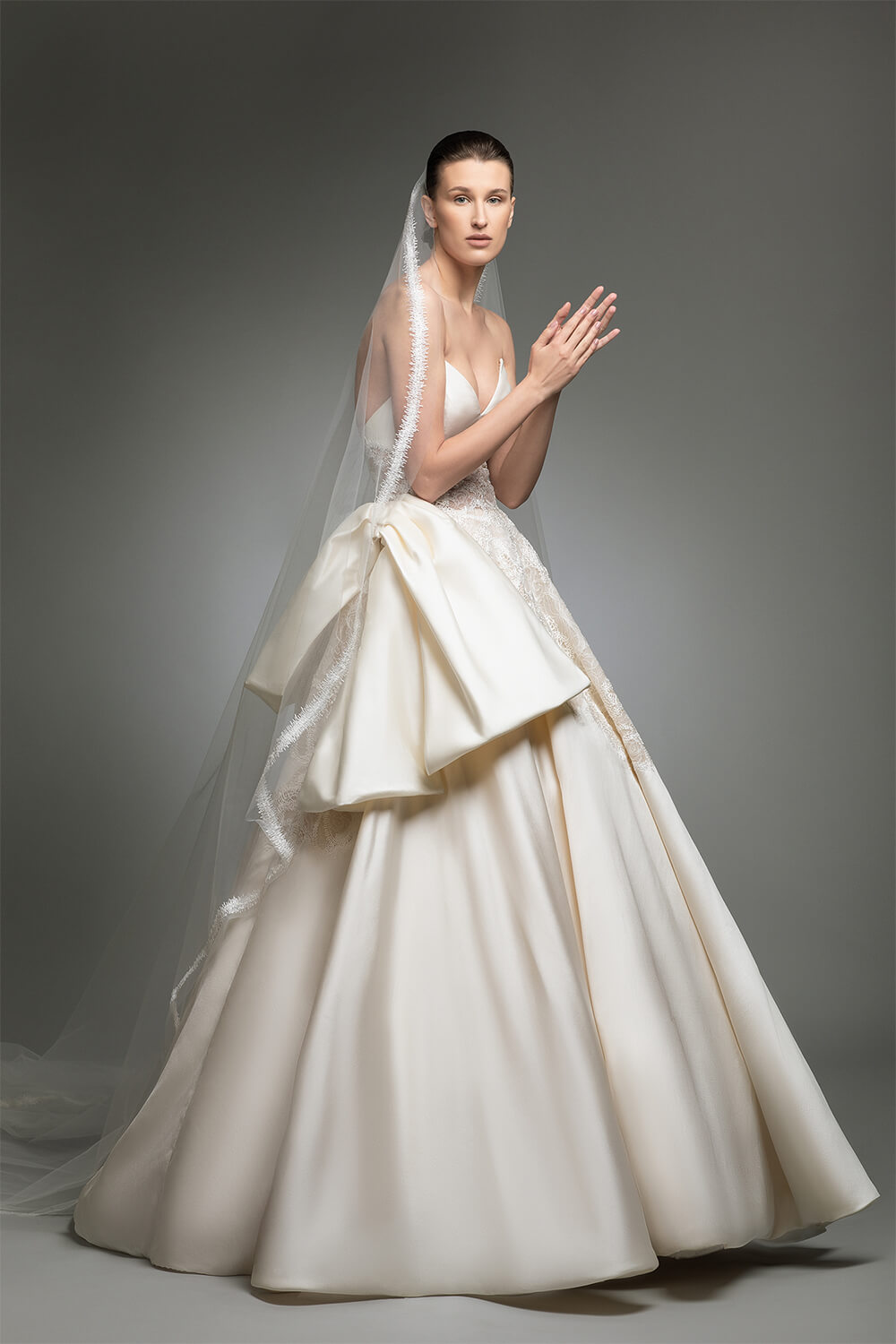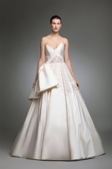 فستان مصنوع من الميكادو بدون حمالات وقصة صدر على شكل الحرف “V”، يتضمّن صدرية متقاطعة، مرصّعة بتفاصيل الدانتيل الإيطالي فضلاً عن عقدة فراشة قابلة للفصل.