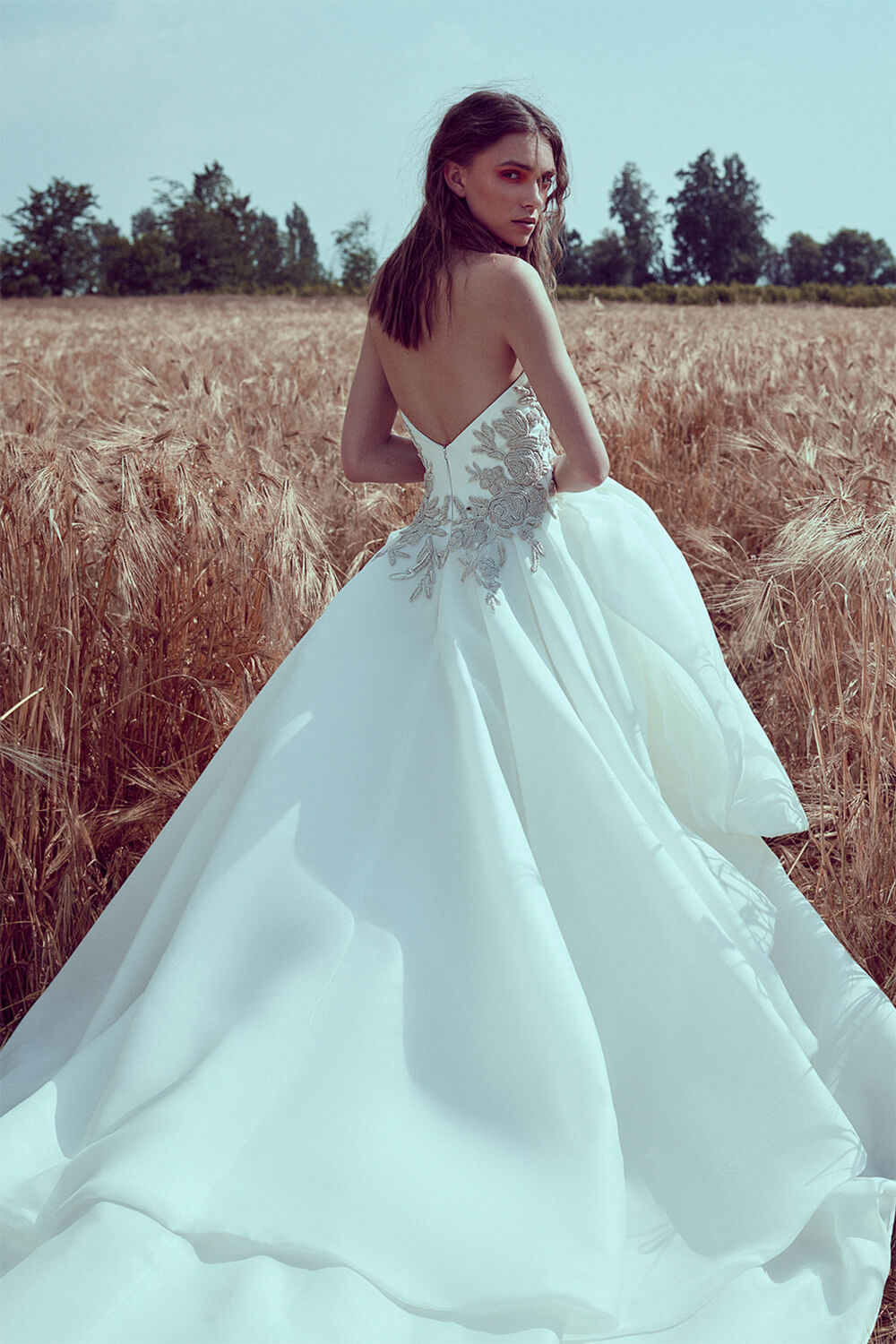 إنه فستان أنيق ببساطته، وهو الخيار المثالي للعروس العصرية. تتألّق القصّة الكلاسيكية بدون حمالات مع عقدة الفراشة الأمامية وتطريز الفينتدج الفضي على الكورسيه للوك فريد يجمع ستايلات عدّة.
