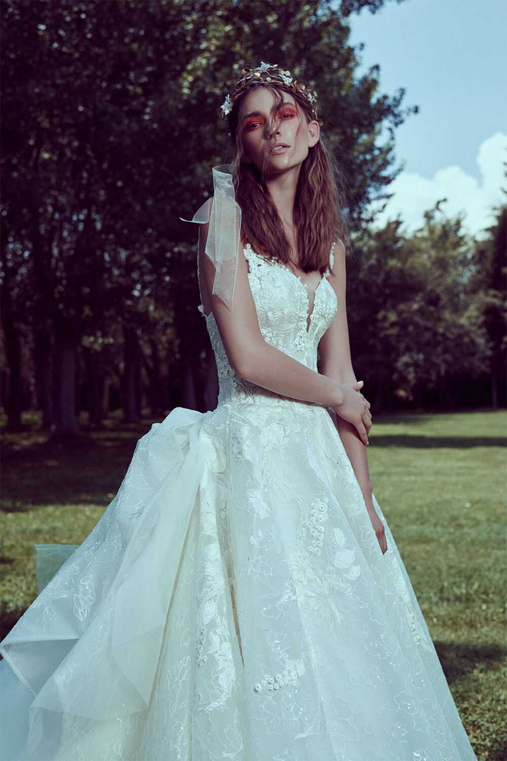 فستان ذات قصة حرف ال A مزيّن بتطريزات الدانتيل للوك ناعم وفاخر. أمّا العنصر الفجائي في الفستان فتم تخصيصه للخلف، حيث إنّ عقدة الفراشة الكبيرة، والتول المكشكش، وفتحة الظهر، تضفي حجماً وحسّيّة.