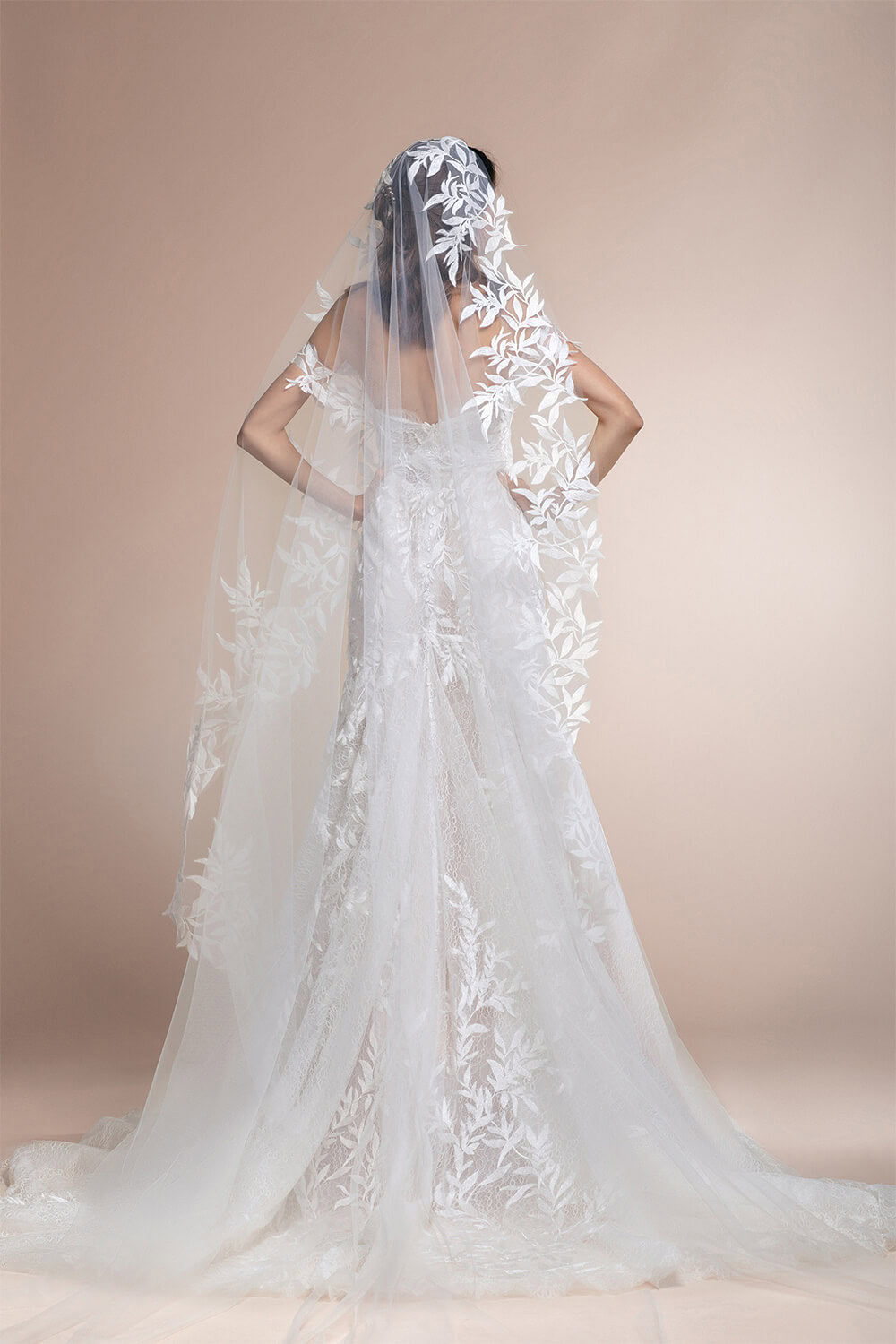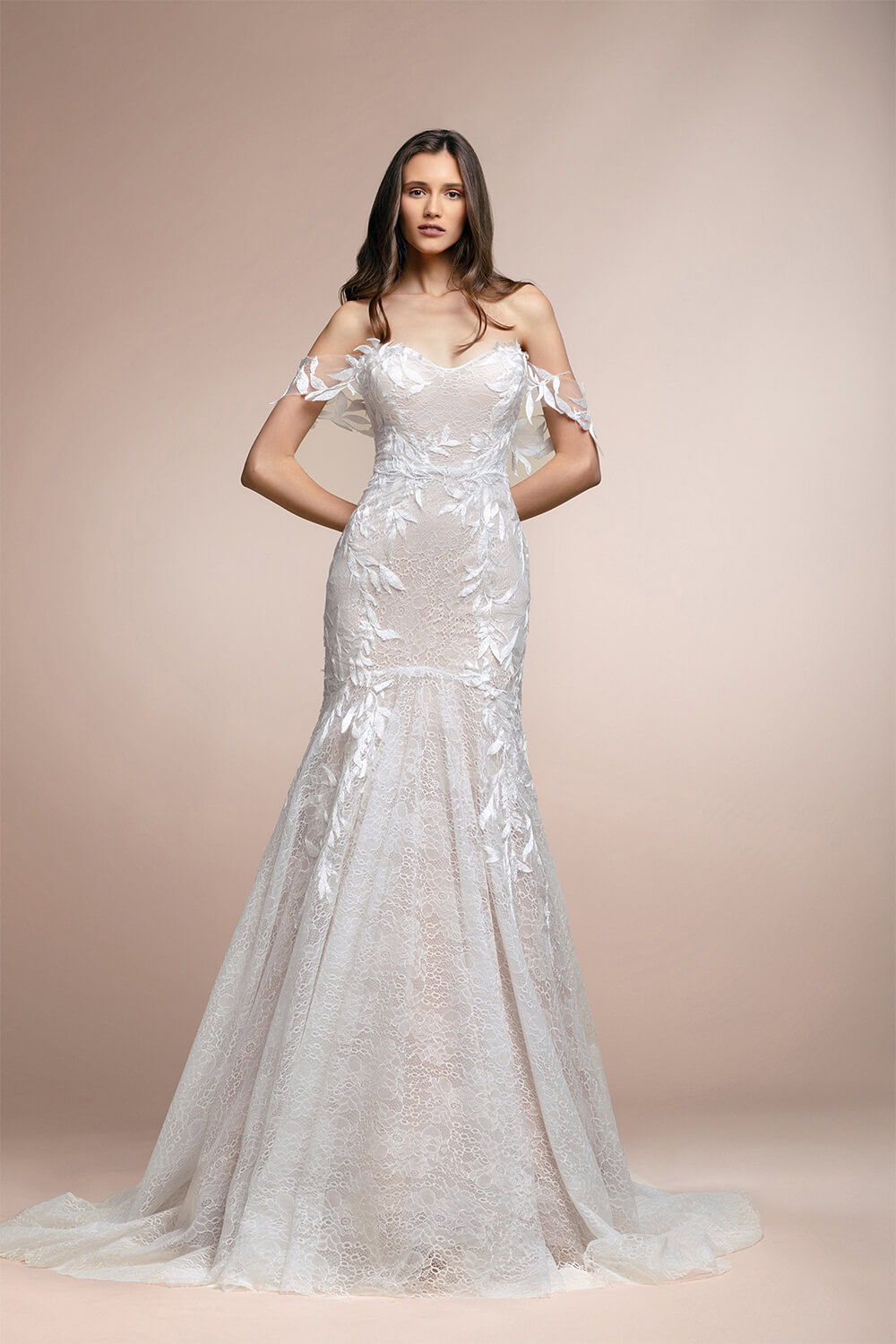 فستان زفاف بقصة حورية البحر مصنوع من الشانتييه النيود مع حزام مزخرف يدوياً ودانتيل مطرّز ومرصّع متميّز بنقشة أوراق الأشجار الأنيقة.
