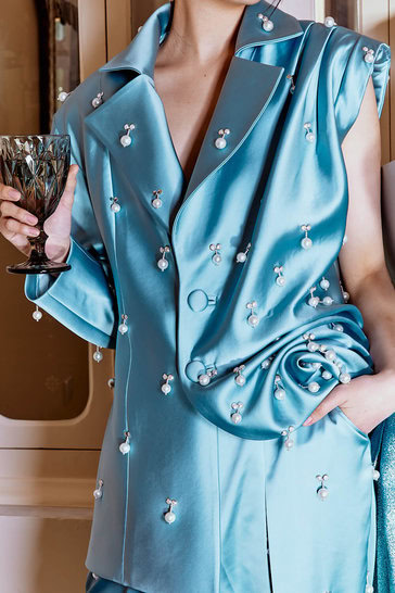 زي كاجوال يناسب كل مناسبة وكل إطلالة! طقم من السراويل والسترة من الساتان مزين باللؤلؤ والكريستال لإضفاء لمسة ساحرة!