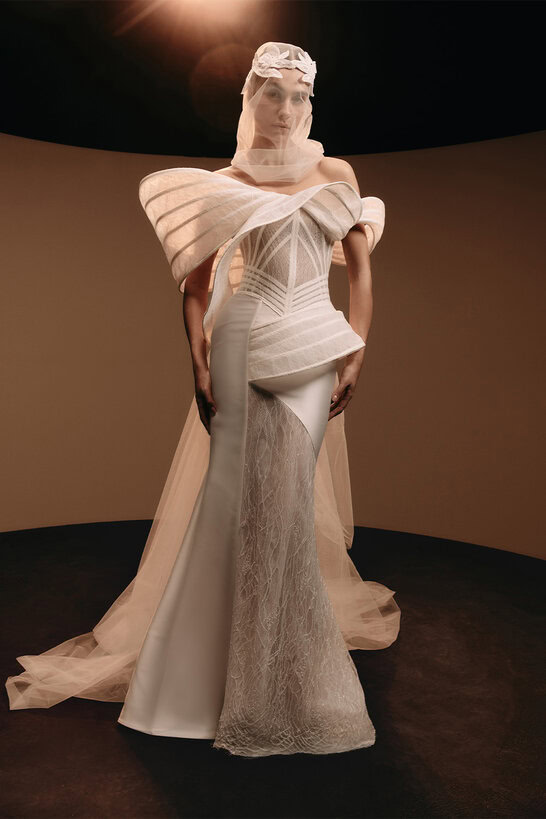 يجمع الكورسيه المعماري بين الساتان المُهيكل وألواح الدانتيل الشفافة لتحديد الخصر بدقّة واضحة.