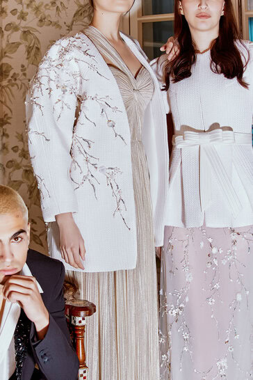 كوني مختلفة مع بيلي! فستان ذهبي لامع فريد من نوعه مع خط عنق غير متماثل، مع سترة بيضاء كبيرة الحجم، مزين بفروع شجرة ساكورا المطرزة والمشكوكة!