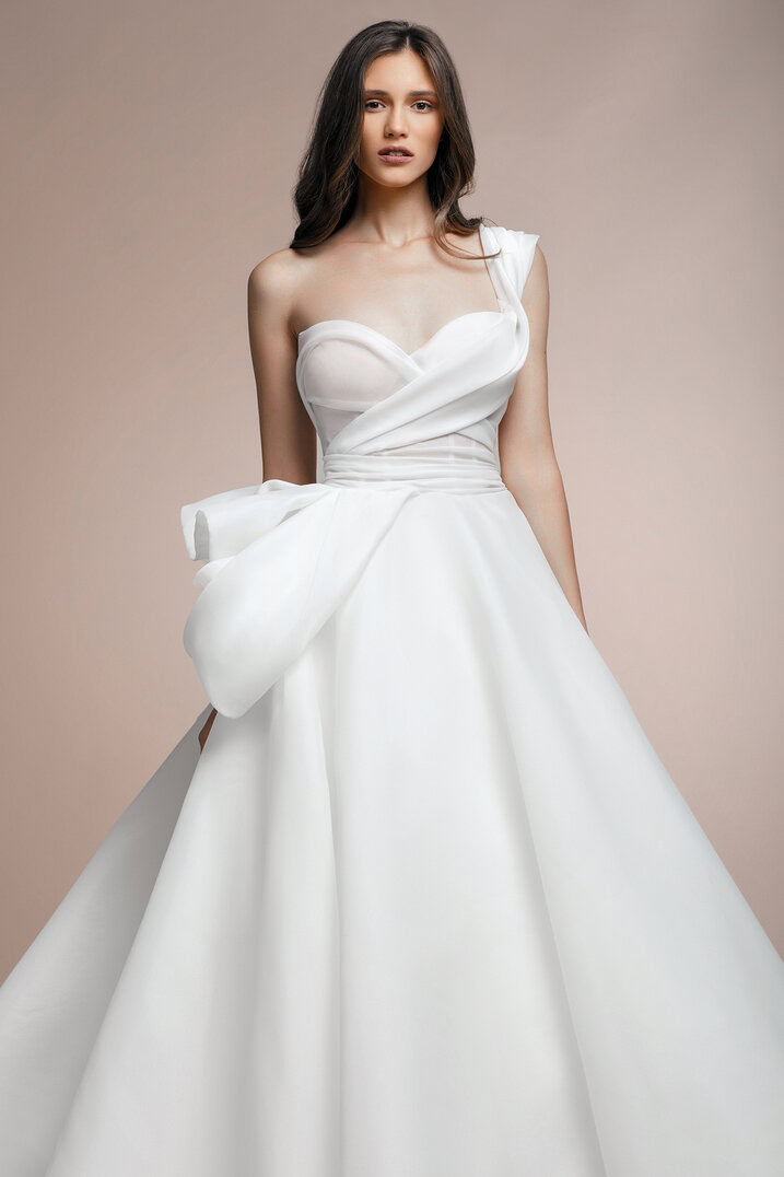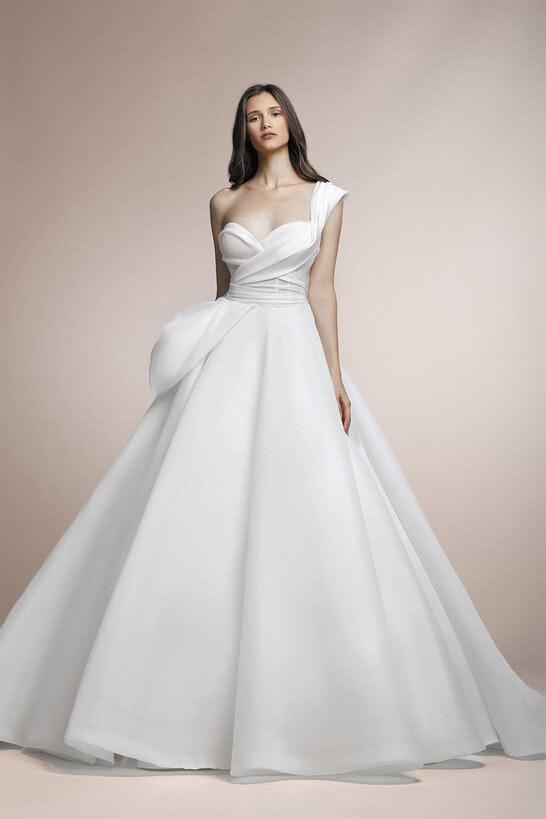 فستان أنيق بقصة الحرف “A” يعبّر عن البساطة من خلال قصّة خط العنق غير المتناسق والفريد من نوعه والذي يبرزه قماش الأورجانزا المزدوج والببلم الملفوف من جانب واحد.