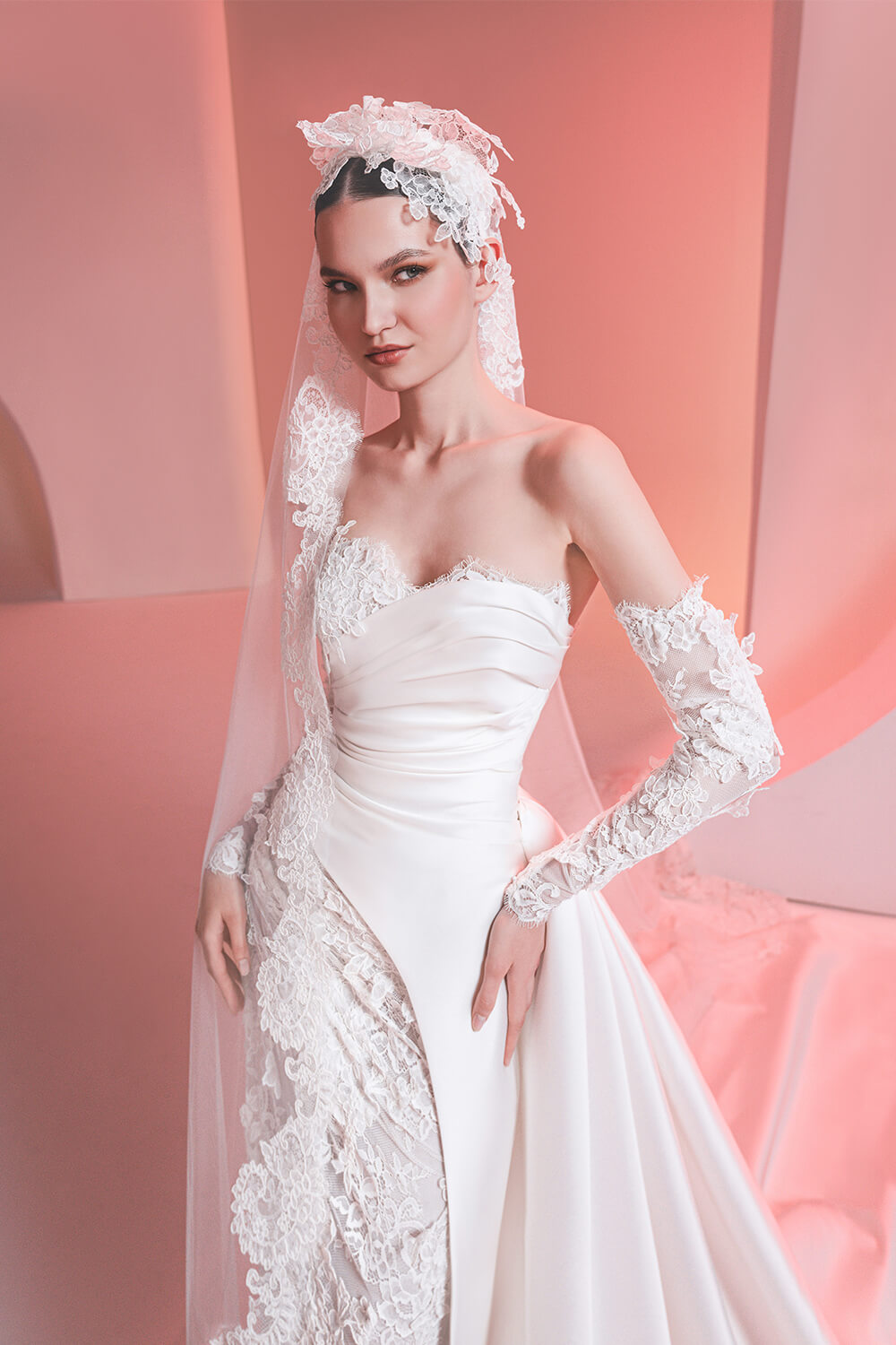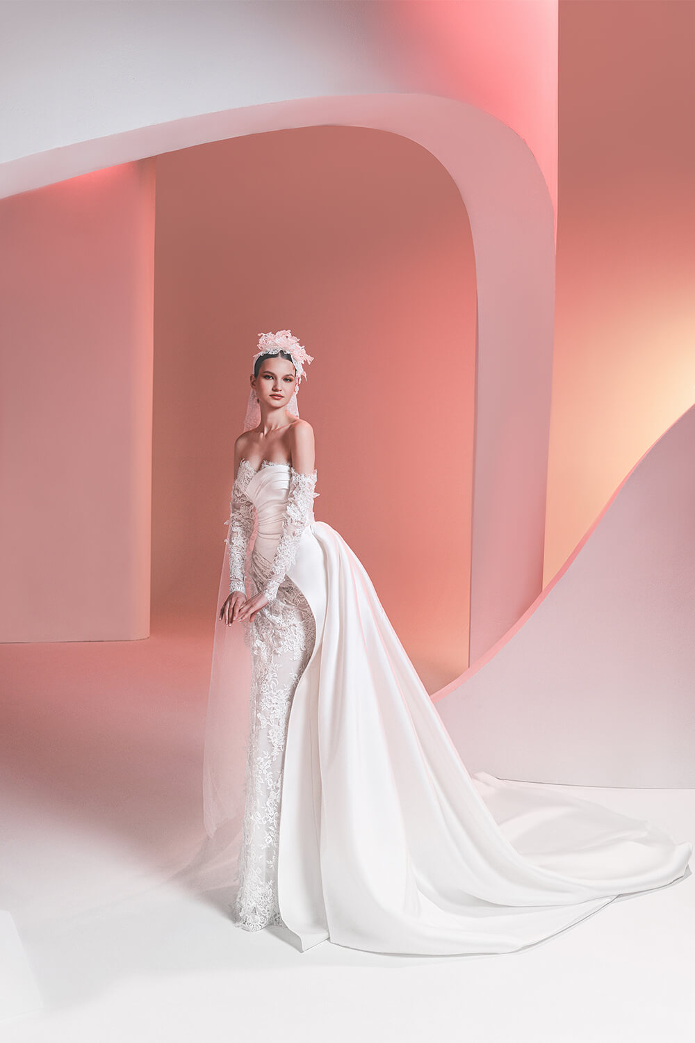 تصميم راقٍ يجمع بين قصّة ضيّقة من الدانتيل وتنورة فخمة من الساتان بطيات تضيف طابعاً ملكياً جريئاً. يتميّز بياقة منسدلة عن الأكتاف وأكمام شفافة مطرّزة تنسج أنوثة ناعمة. الذيل الطويل المصنوع من الساتان ينسدل بانسيابية لافتة تُكمل التوازن بين الهيكلية والرقة.