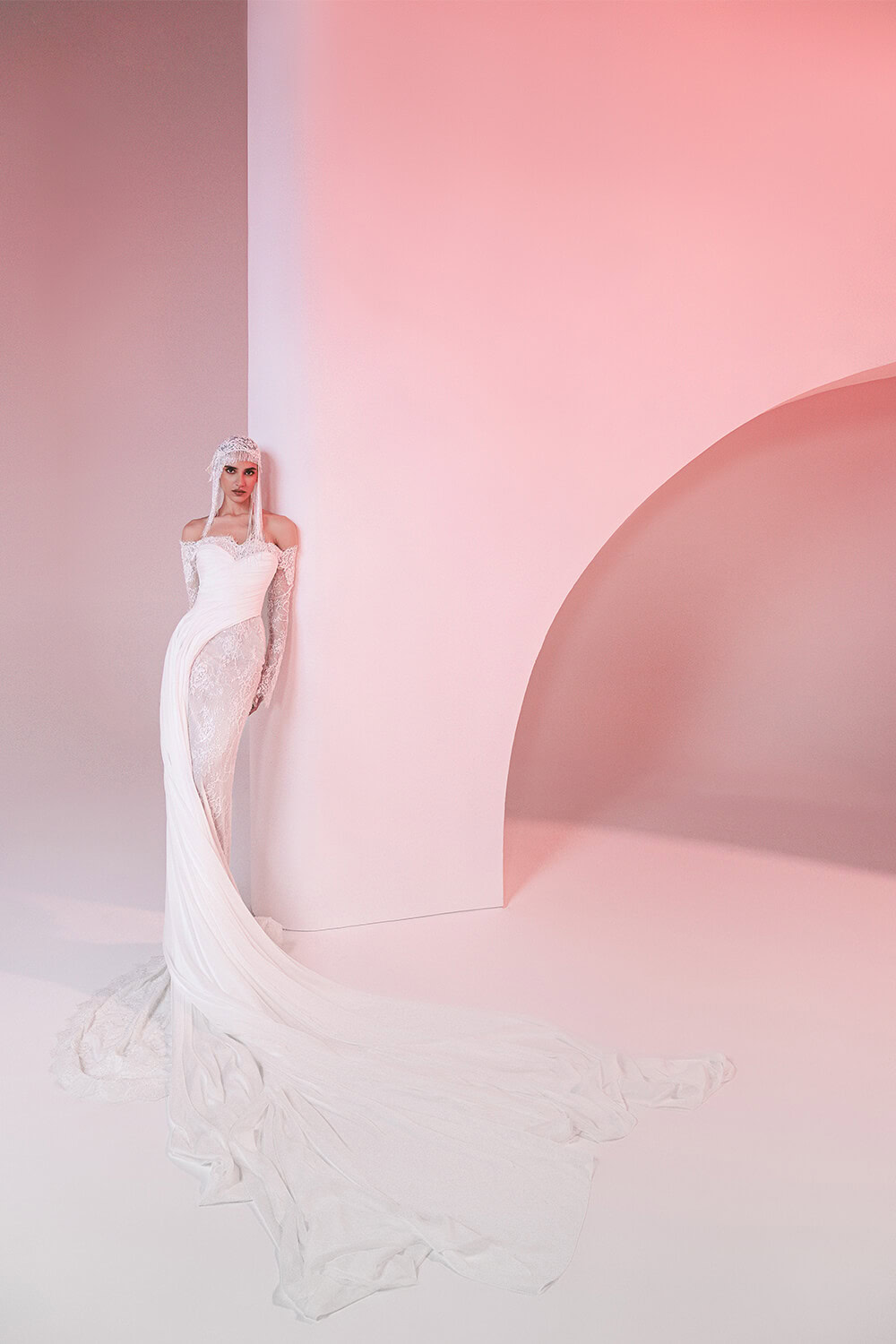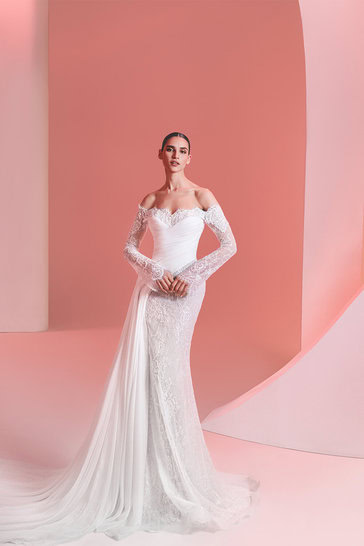 “فستان حورية بلمسة نحتيّة يجمع بين الدانتيل الشفّاف وتفاصيل الشيفون المنسدل. يتميّز بياقة منسدلة عن الأكتاف وأكمام دانتيل ضيّقة، مع صدرية بطيات تحدد الخصر بأسلوب أنيق. ينسدل الذيل بانسيابية ناعمة تضيف حركة ساحرة إلى القصّة الأنثوية.