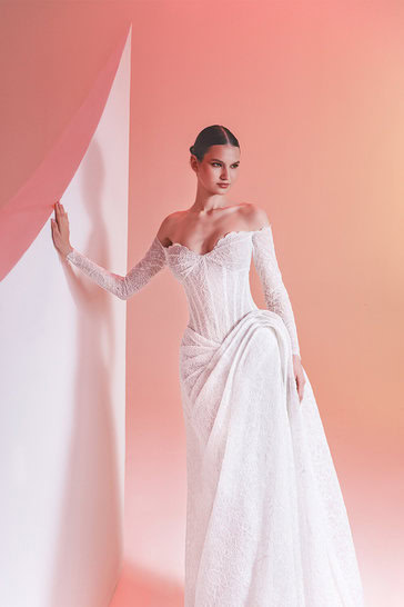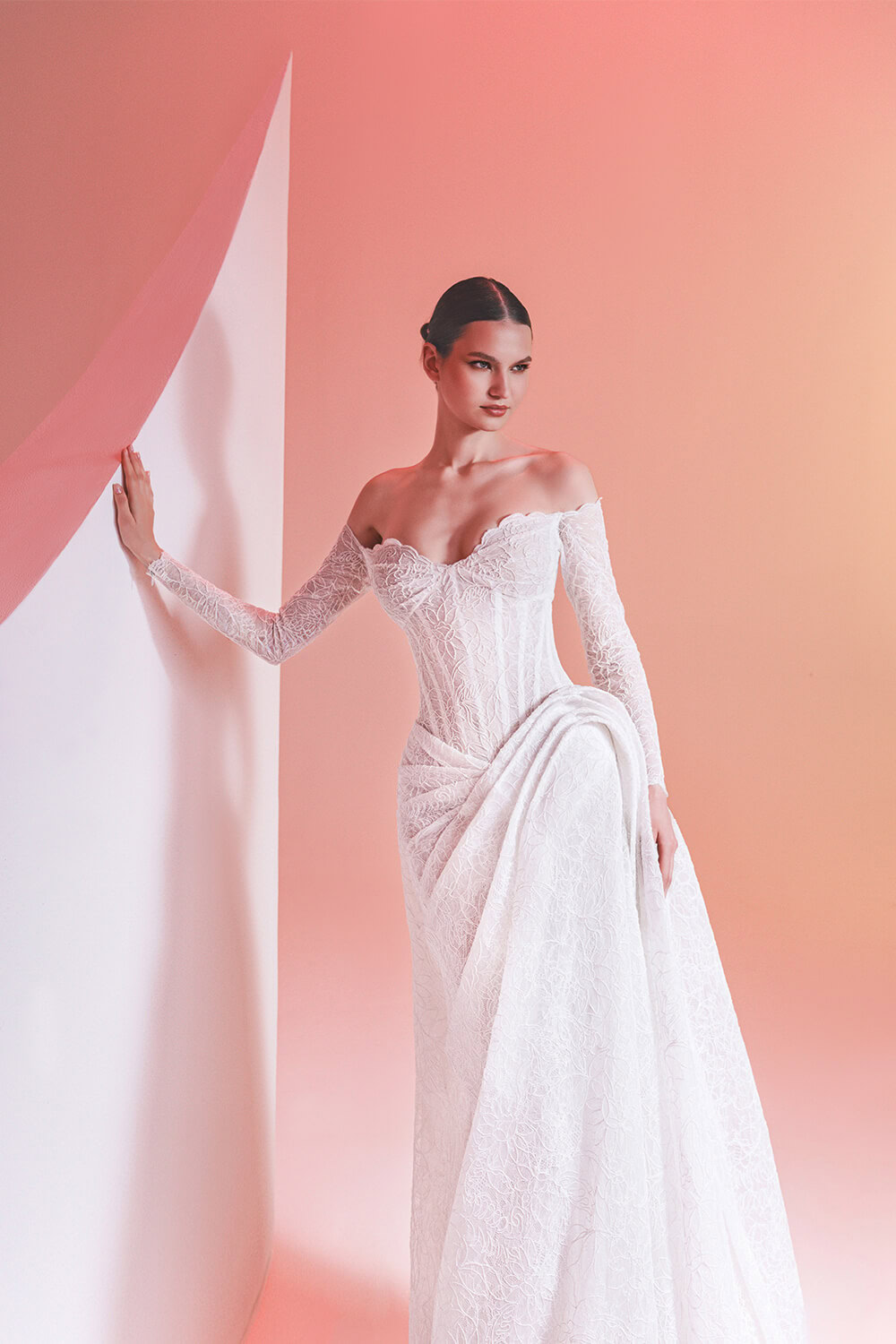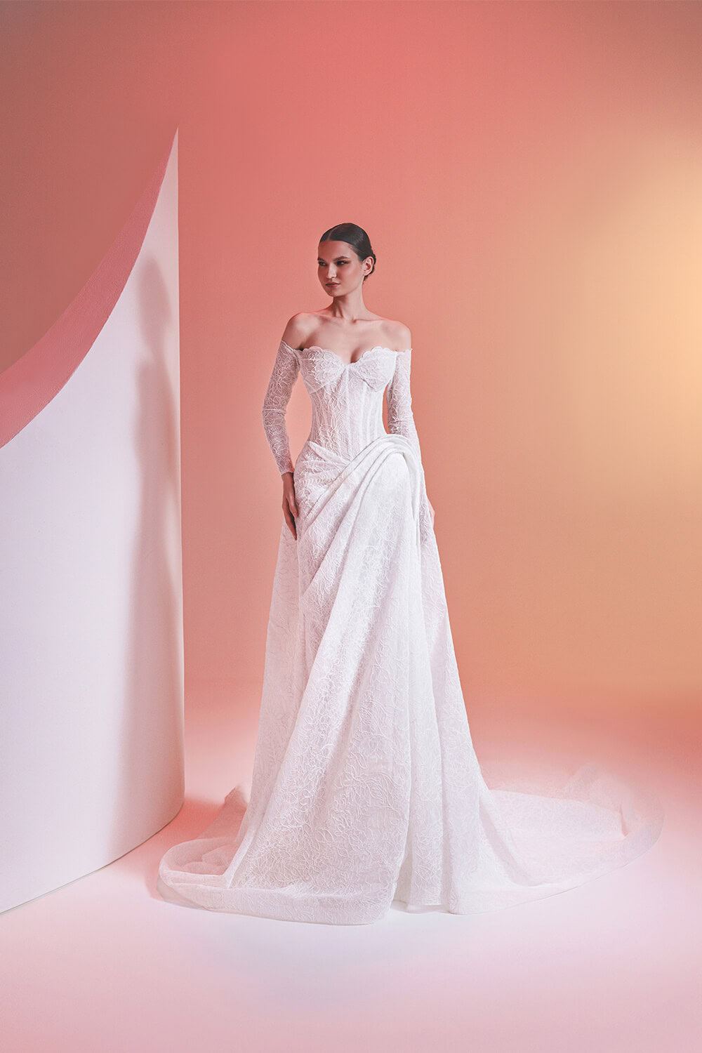 فستان راقٍ بياقة منسدلة عن الأكتاف، يتميّز بكورسيه منحوت وأكمام طويلة ضيّقة. مصمّم من دانتيل ناعم الملمس، مع تفاصيل منسدلة عند الخصر تمنح الفستان لمسة أنثوية أنيقة. الذيل الواسع وهيكل الصدر المكشوف يضفيان طابعًا هوت كوتور على القصّة الحالمة.