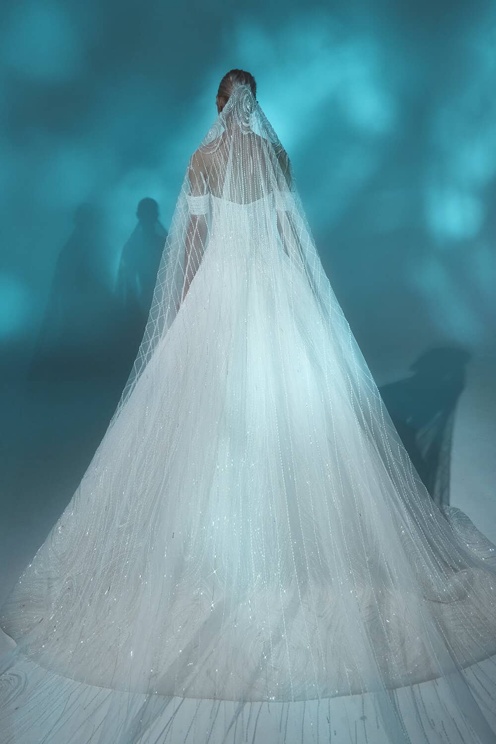 إطلالة أميرة عصرية مع خطّ عنق مكشوفة الأكتاف تضيف لمسة من الرومانسية والأنوثة. الفستان مصمم بمشد ضيق وتنورة على شكل حرف A، مصنوع من أجود أقمشة التول ونقوش الكورنيلي. إنه مطرز بالكامل بالكريستال واللؤلؤ للحصول على مظهر زفاف لامع.