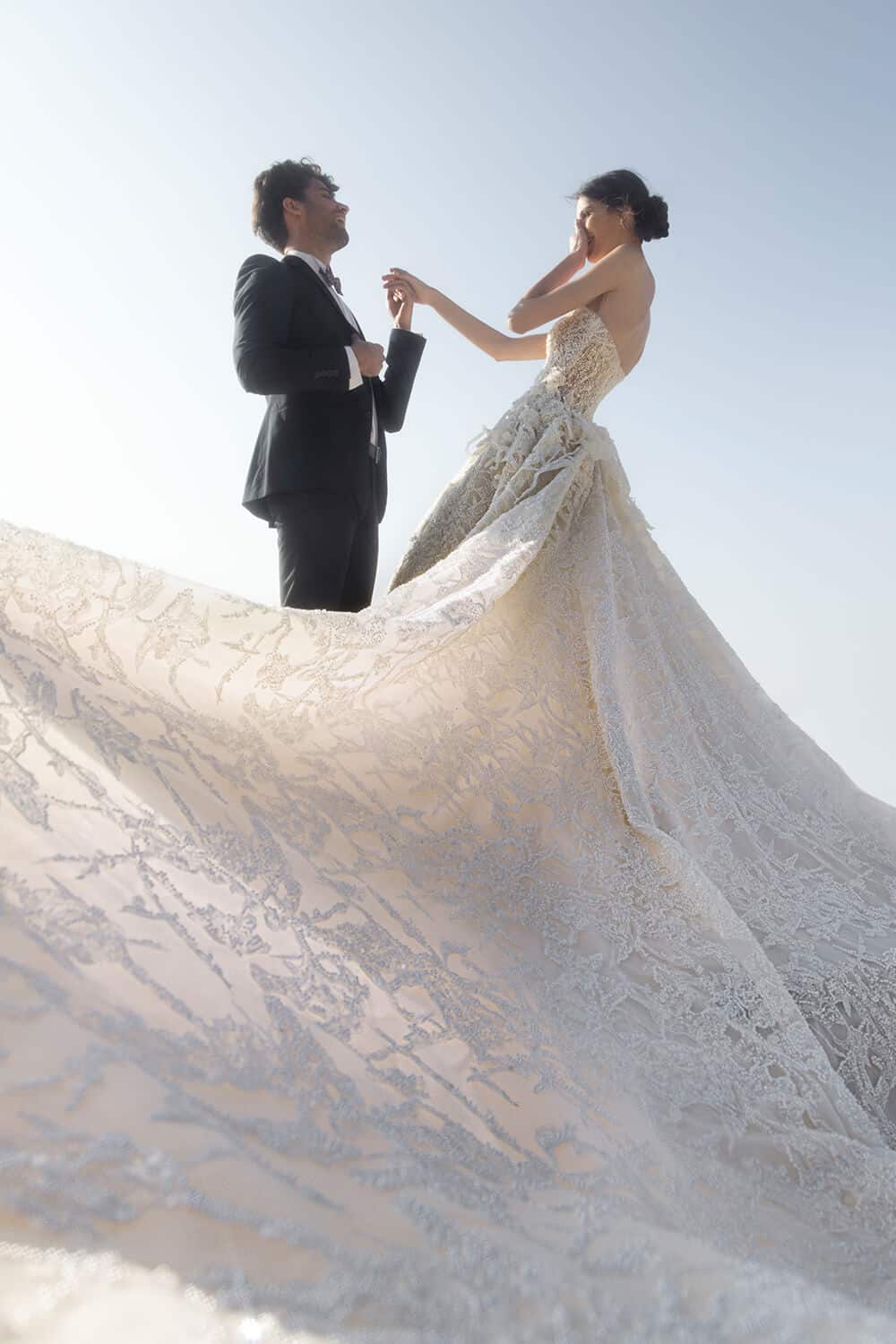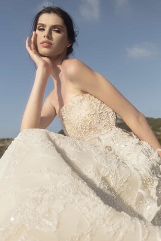 الفتي الأنظار في هذا الفستان المذهل من الدانتيل المزيّن بالخرز والمطرّز باللآلئ والكريستال. يقدم خط العنق بدون حمالات مظهرًا أنثويًا رقيقًا وتنورته الضخمة مزينة بزخارف نباتية ثلاثية الأبعاد على الجانبين.