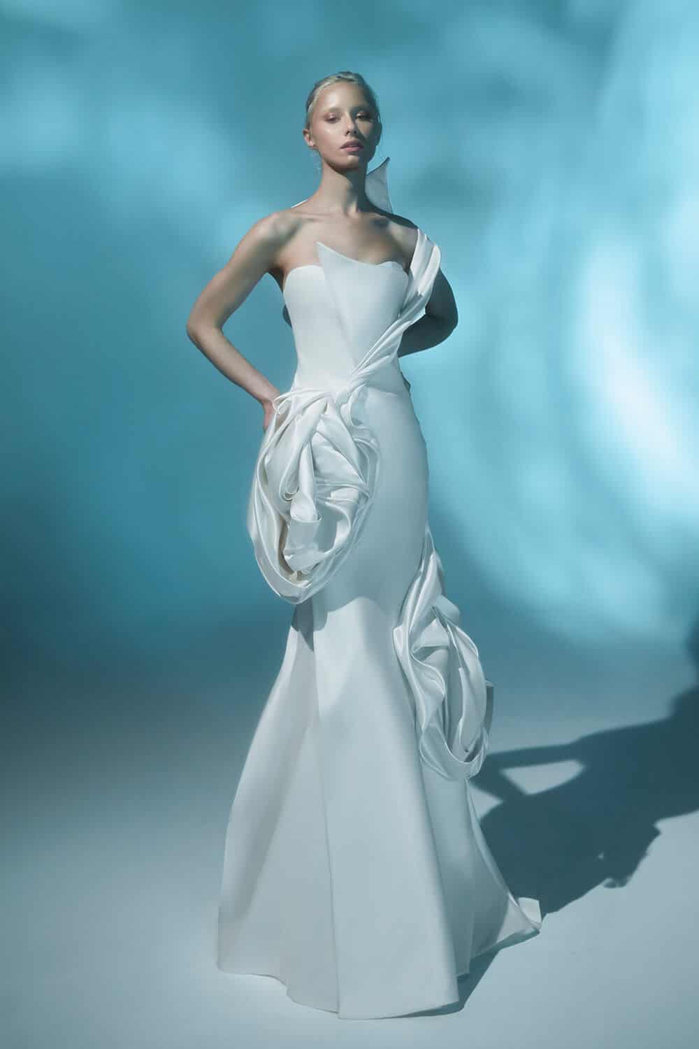 أناقة نقية ورقيّ مع خط عنق بدون أشرطة وتنورة ضيّقة. إنه مزين بتفاصيل مجمعة على الجانب الأيمن ويمتد إلى الجزء الخلفي من الفستان، مما يحاكي شكل الأمواج المتلاطمة، مما يخلق تأثيرًا متموجًا.