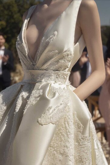 فستان زفاف ميكادو بياقة على شكل V وأشرطة سميكة. تعتبر فيليسيا مثالية للعروس الناعمة التي ترغب في ارتداء ثوب الكرة في يوم زفافها ، ولكن مع لمسة معاصرة. تتميز بتطريزات من الدانتيل المزيّن بالخرز وجيوب جانبية لمزيد من الراحة!