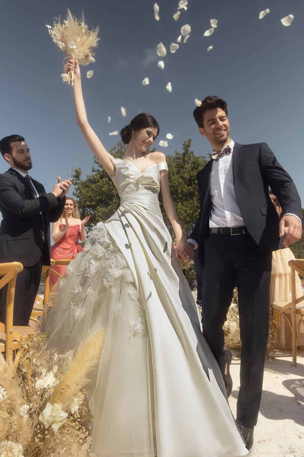 فستان ميكادو مكشوف الأكتاف يتميز بتفاصيل مطوية على صد وأعلى التنورة. يتميز بلمسة مثيرة مع قماش التول على جانب واحد ، مزين بزهور الأورجانزا ثلاثية الأبعاد والريش.