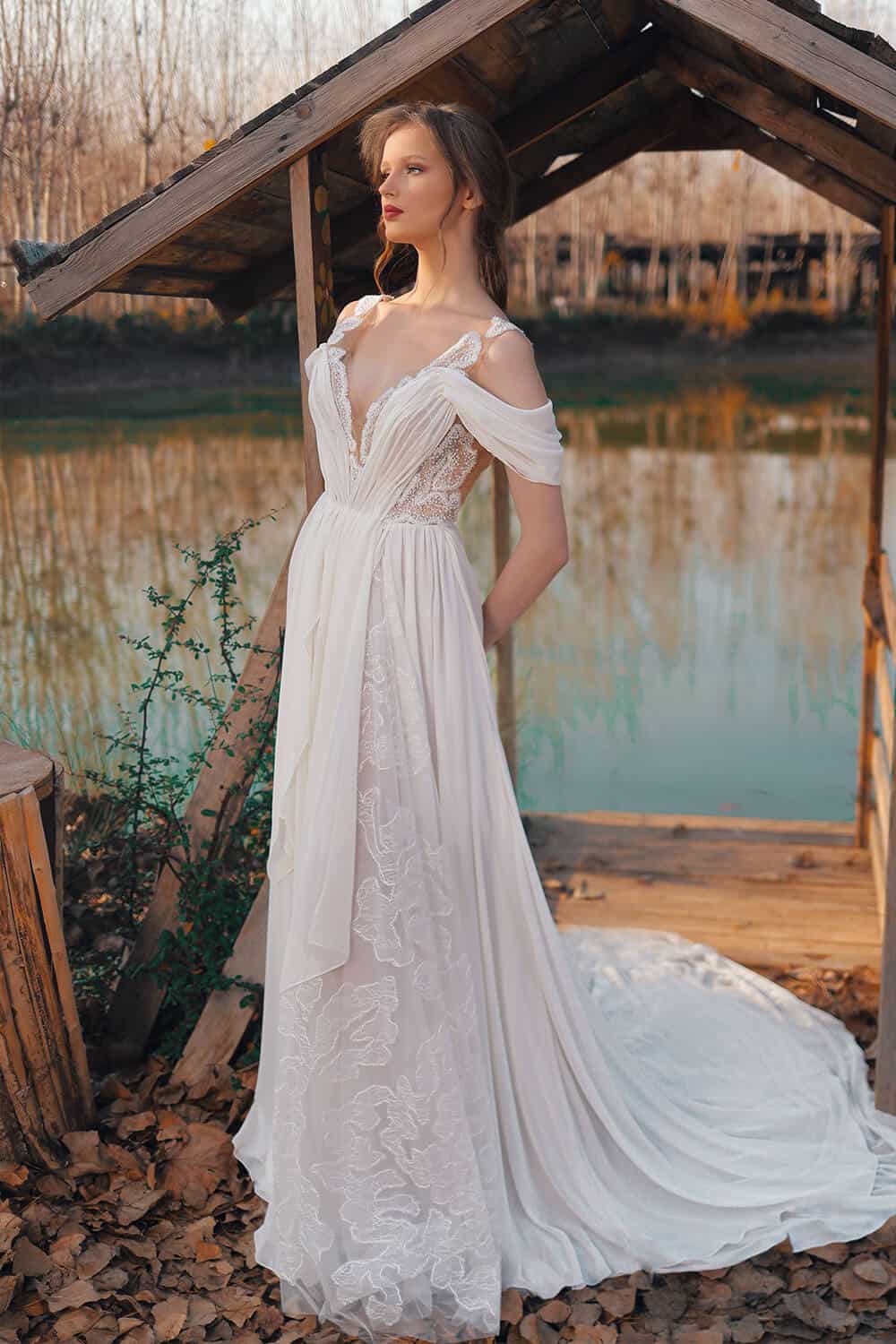 فستان انسيابي مع أحزمة سميكة وأشرطة فضفاضة من خارج الأكتاف تتميز بياقة متدلية وقصّات شفافة حول الصدر. تتدرج التنورة بشكل فضفاض وأنيق بأسلوب معاصر، مما يجعلها الاندماج المثالي بين الحداثة والرومانسية!