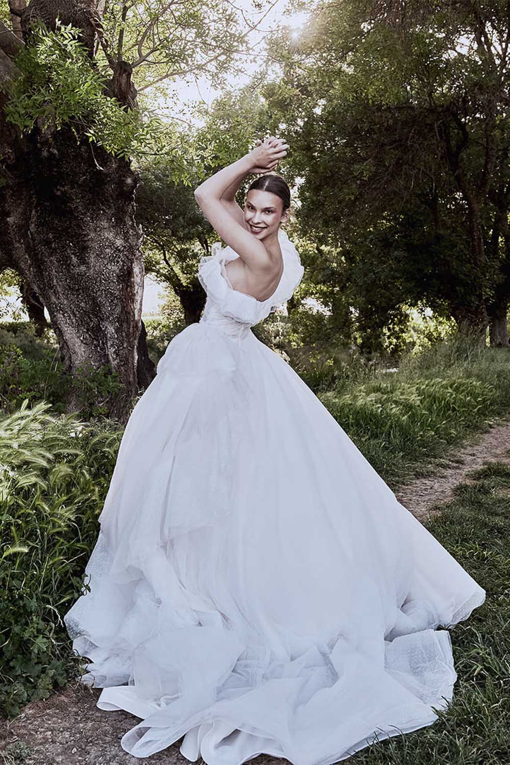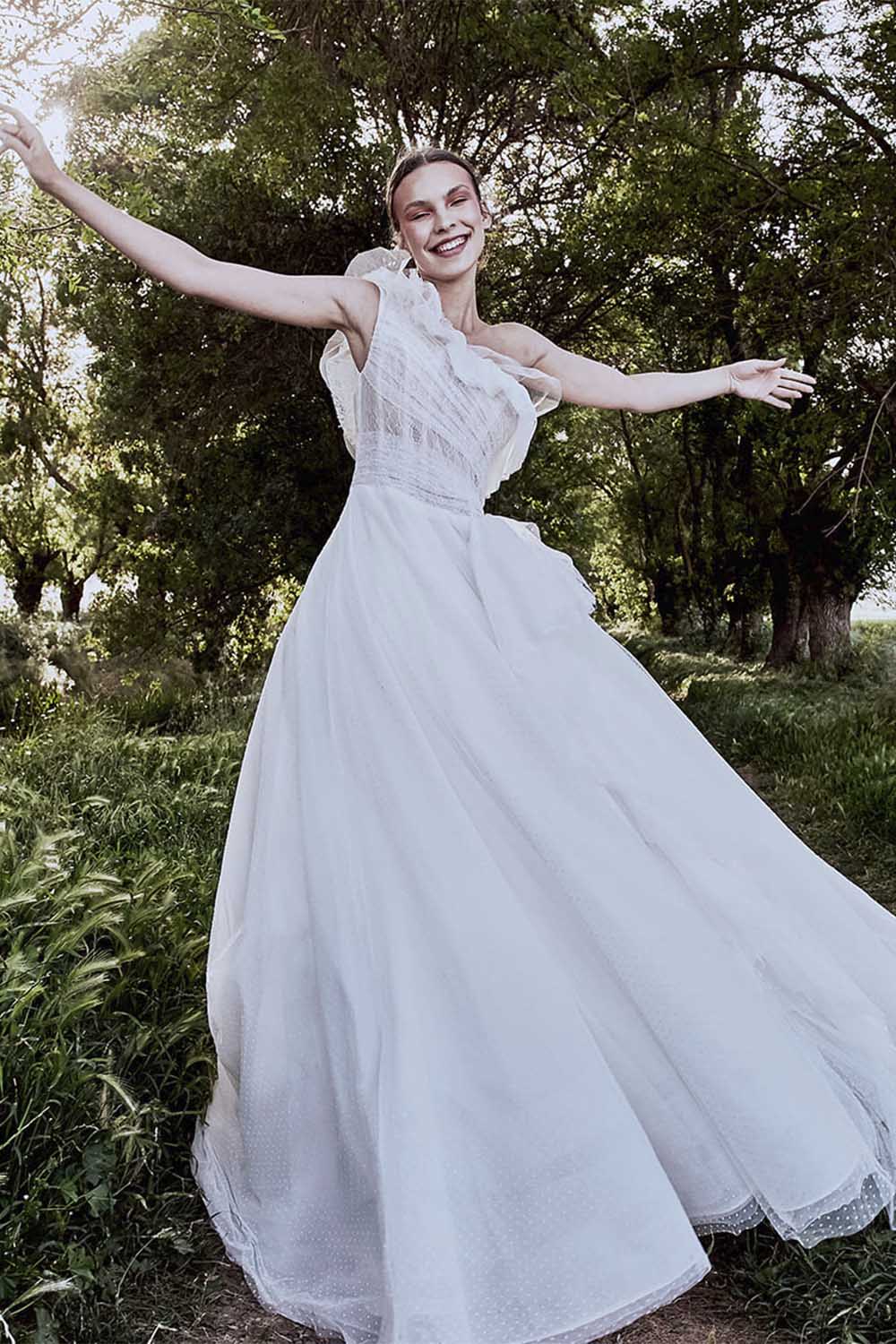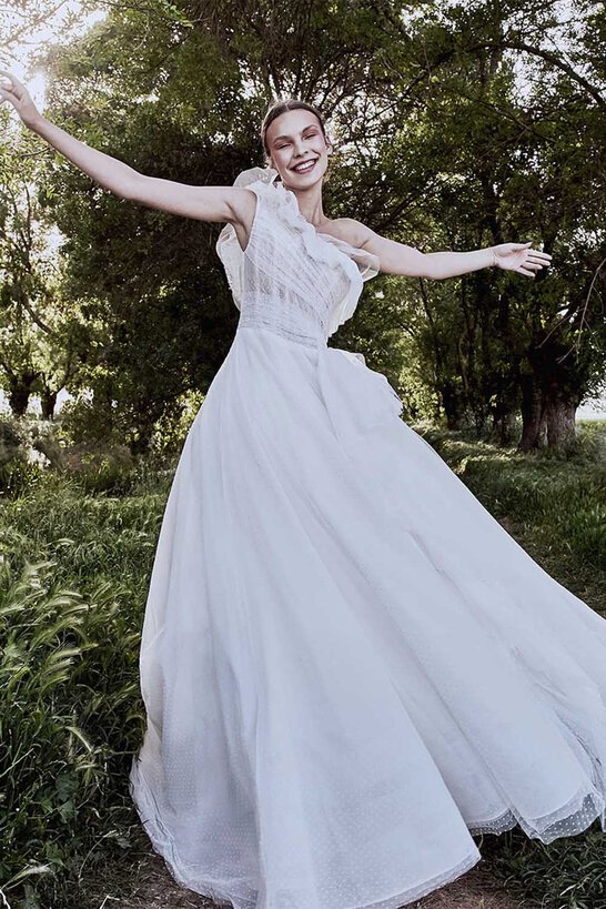 يمتاز هذا الفستان ذات الكتف الواحد بلوك ناعم للغاية مع التول المنقّط بشكل كامل. وتبرز نعومته بشكل خاص من خلال القماش المتدلّي بطبقاته العديدة والكشكشات.