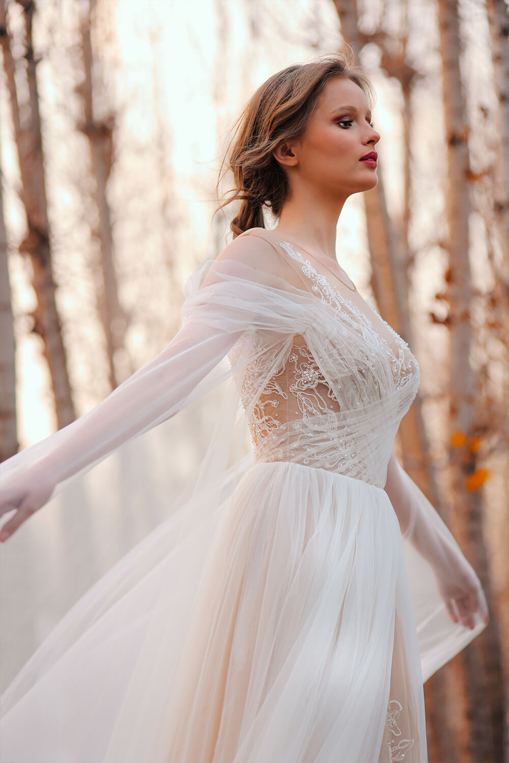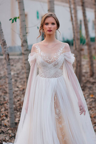 فستان زفاف عصري بأسلوب كورسيه مميز مع تصميمات من التول المتقاطعة وأحزمة على الكتفين. صدّره مزين بالدانتيل المطرز والكريستال المرصّع بالخرز واللآلئ ، وهو يتدلى بأناقة في تنورة متدفقة من التول ، ويتميز بشق جانبي مع دانتيل متناسق!