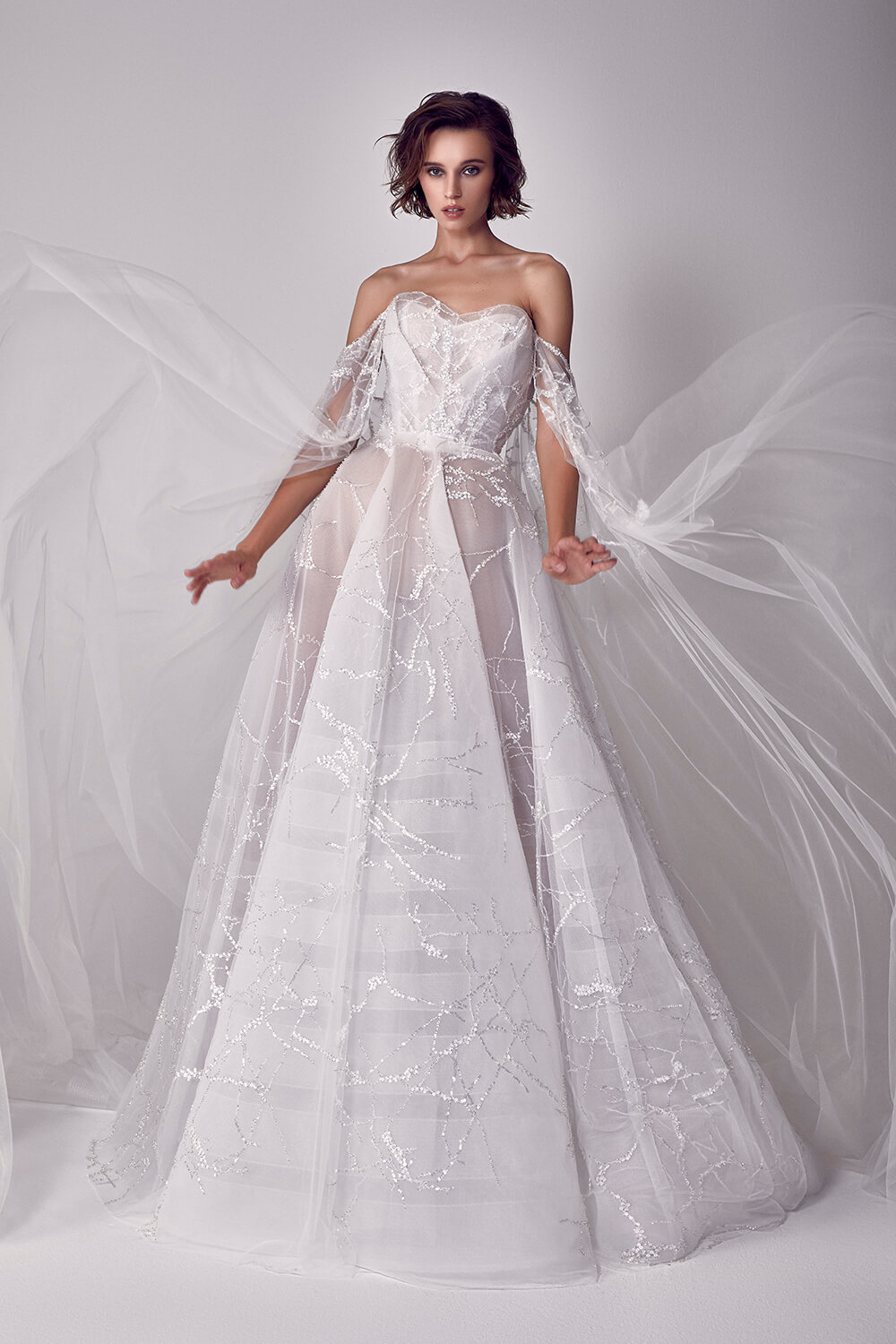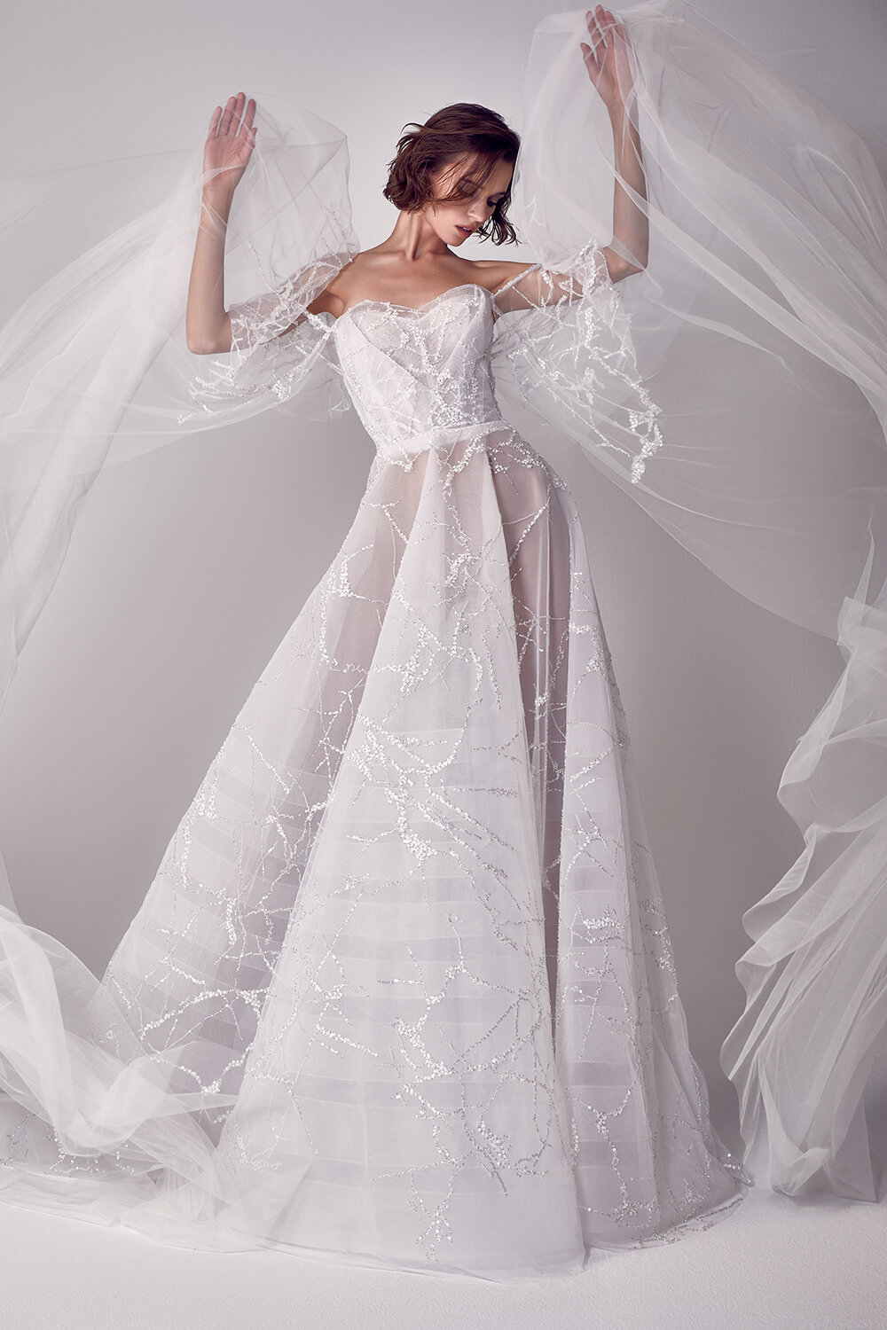 فستان زفاف من دون أشرطة وبأكمام طويلة شفّافة وواسعة، مُرفق بتنّورة مُزيّنة بالتطريز النّاعم