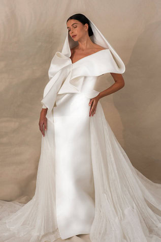 فستان نانسي يتميز بتصميم طويل وأنيق مع سترة سكوبا بيضاء. الطيات الجانبية تضيف ملمسًا بصريًا رائعًا، فيما يبرز غطاء الرأس لمسة من الغموض. مستوحى من عباءة عصر النهضة، يمنح الفستان مظهرًا معاصرًا وساحرًا.