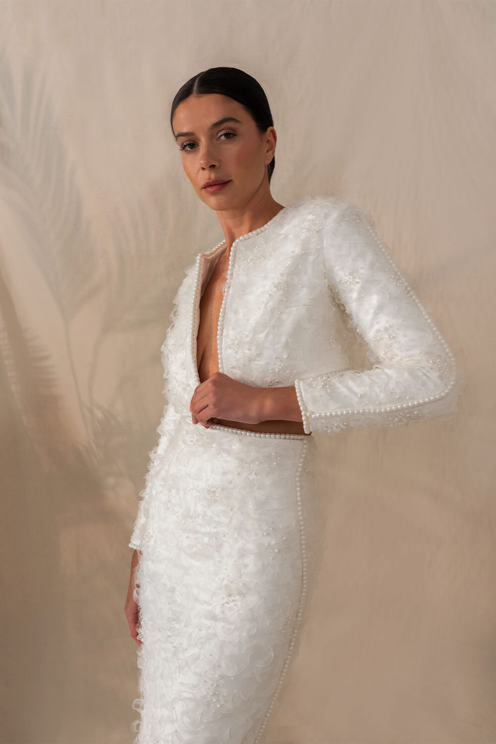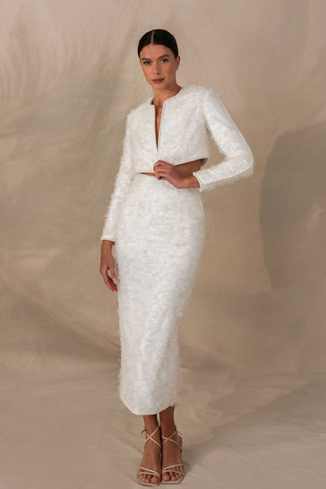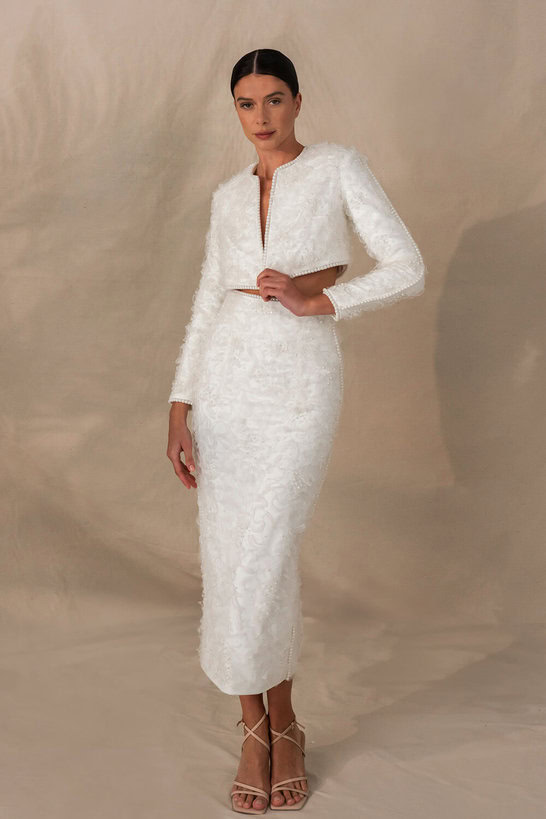 نيا مصمم من قطعتين تتميز بلمسة فنية مع تفاصيل خرزية دقيقة على قماش الكريب الأبيض. التنورة الضيقة ذات الطول المتوسط ترافقها سترة قصيرة أنيقة، مع خطوط لؤلؤية تضيف لمسة من الرقي. هذه القطعة مزيج من العصرية والحرفية الخالدة