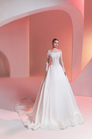 فستان قصة أميرة فاخر يجمع بين الحجم الملكي والشفافية الراقية. يتميّز بكورسيه مع تفاصيل ظاهرة مصنوع من الدانتيل الناعم، مع أكمام طويلة شفّافة وياقة منسدلة عن الأكتاف. تنسدل التنورة الستانية، وتزدان بتطريزات دقيقة تضيف لمسة من الرقي.