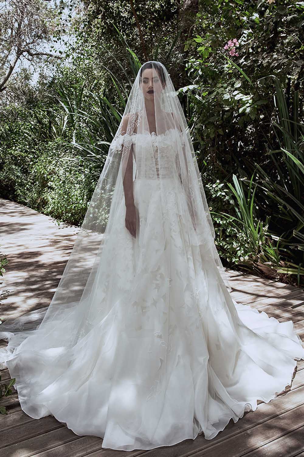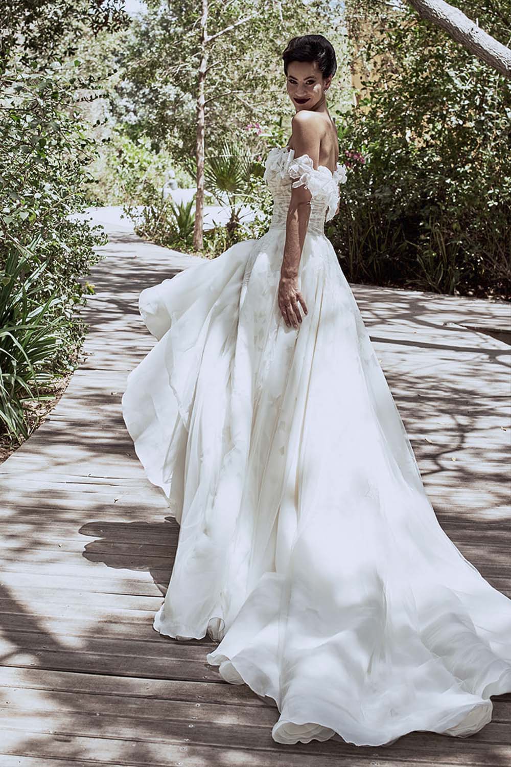 فستان زفاف رائع بلونه العاجي يتميّز بطبقات من حرير الأورجانزا الناعم والرقيق. أما الكورسيه فهي عبارة عن براعة فنية دقيقة في كوتور التول، وهي مموجة بشكل ملتوٍ، ومزخرفة بشكل كامل، ومزينة بطوق جميل مصنوع من الأورجنزا. تعرض التنورة شكلاً مقطعاً بالليزر بإتقان بتفاصيل الزخرفات الناعمة الجميلة.
