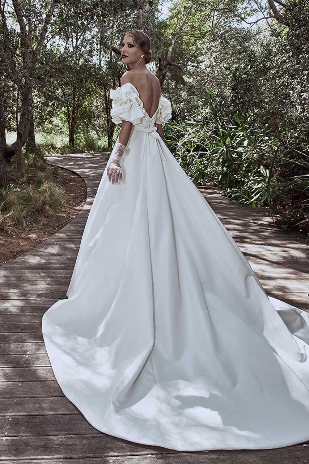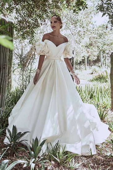 فستان زفاف ضخم، عاري الكتفين ومُرصّع بالكريستال وحبّات اللؤلؤ. مصنوع من أرقى الأنسجة ومُصمم بشكل يُظهر جمال العروس في يومها المُنتظر