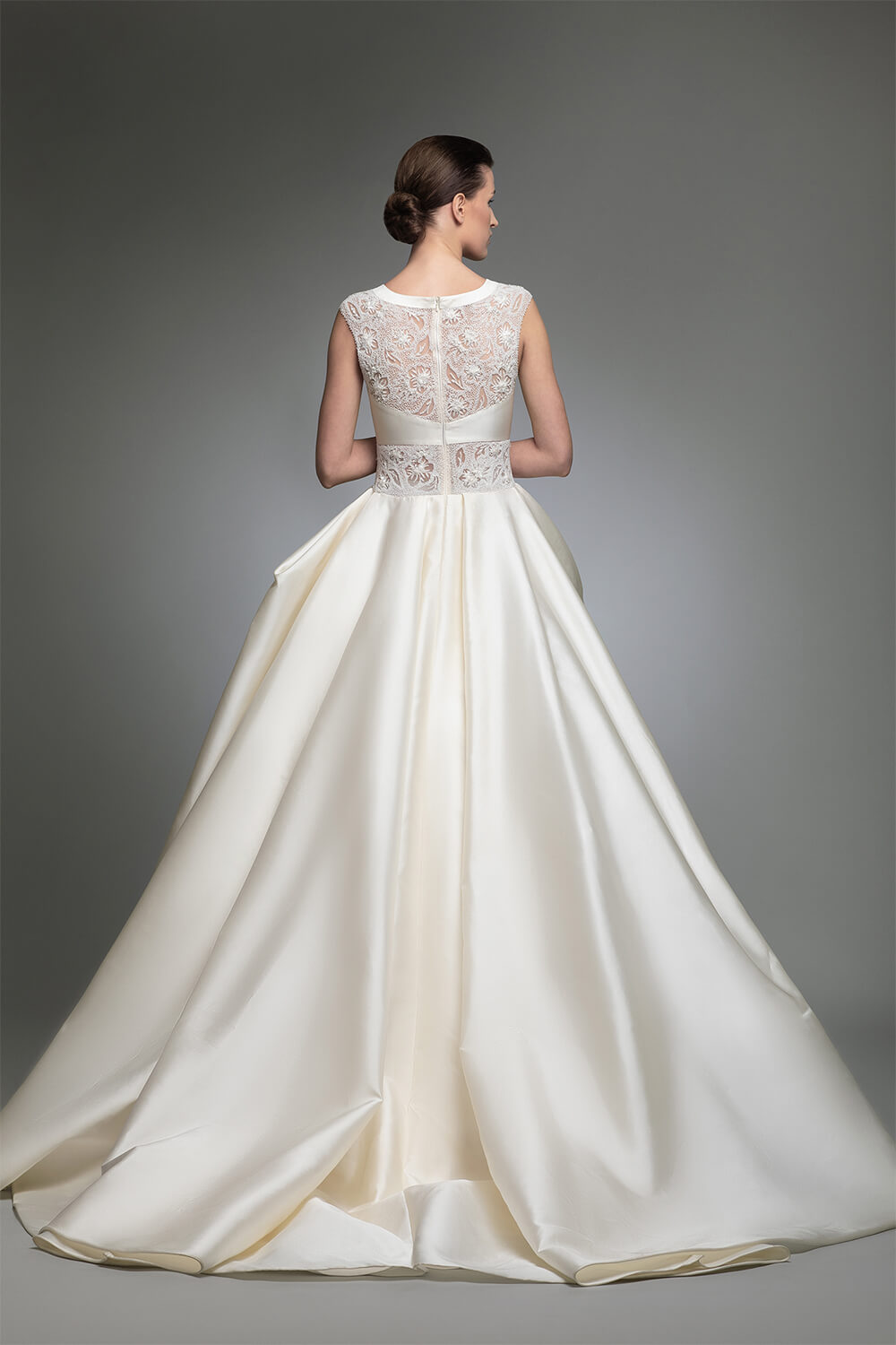 فستان ذات حجم منفوخ مصنوع من حرير الميكادو وذات القصة المفتوحة والكاشفة للصدر، متميّز بتنورة مرتفعة عند أطراف الخصر وبتفاصيل اللآلئ الصغيرة.