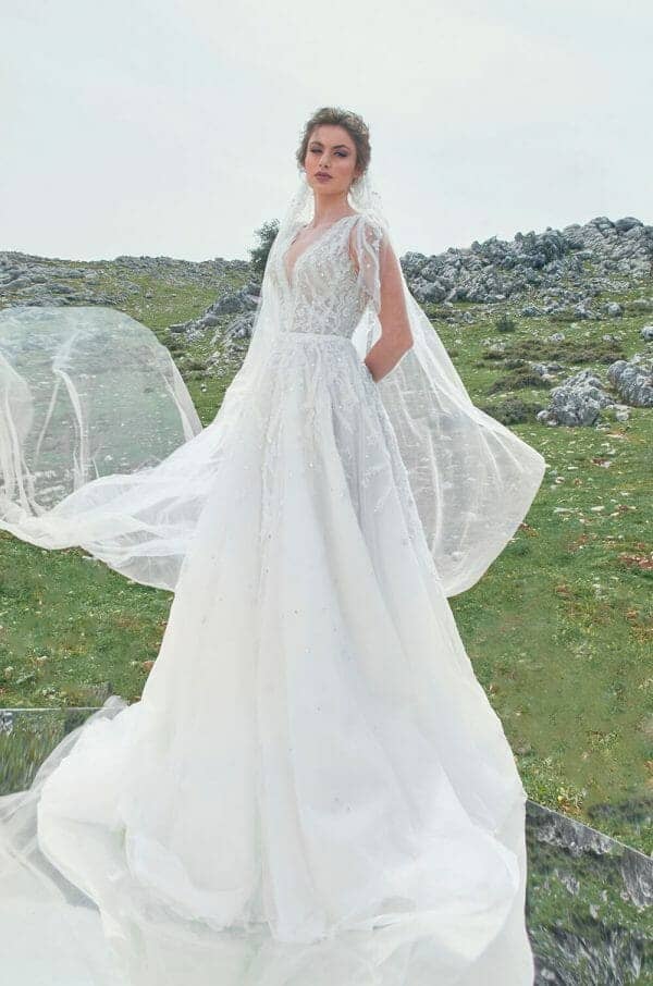 An assortment of sharp angles and sensuality flourishing the effervescence of hand-sewn beads and pearls, all while voluptuous gowns twirl with both majestic and graceful fabrics, gleaming with thousands for beads and crystals, handmade in distinct patterns representing tree branches and water cascading down in the most romantic manner. Enchanting incrusted tulle, beaming crystals and abstract floral embellishments, layered in horizontal shapes recalling a lustrous sunset. The bodices feature feminine corsets in square necklines, asymmetrical as well as plunging and sweetheart necklines, immortalizing the circle of nature. Incorporating softness and feelings, long cape-like veils fall gracefully in a weightless ethereal look.