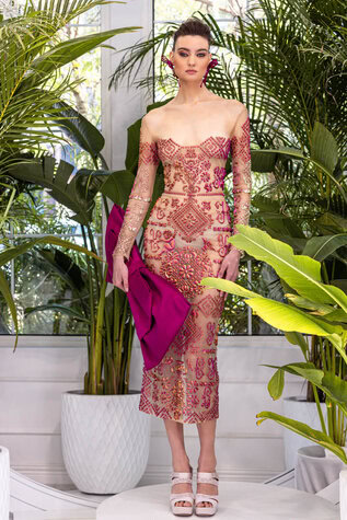 A mesmerizing ode to the Desert Sadu, this sheer midi dress is adorned with intricate embroidery, echoing the geometric beauty of traditional Bedouin weaves. The warm hues and delicate embellishments reflect the desert’s golden glow, capturing elegance and heritage in perfect harmony.