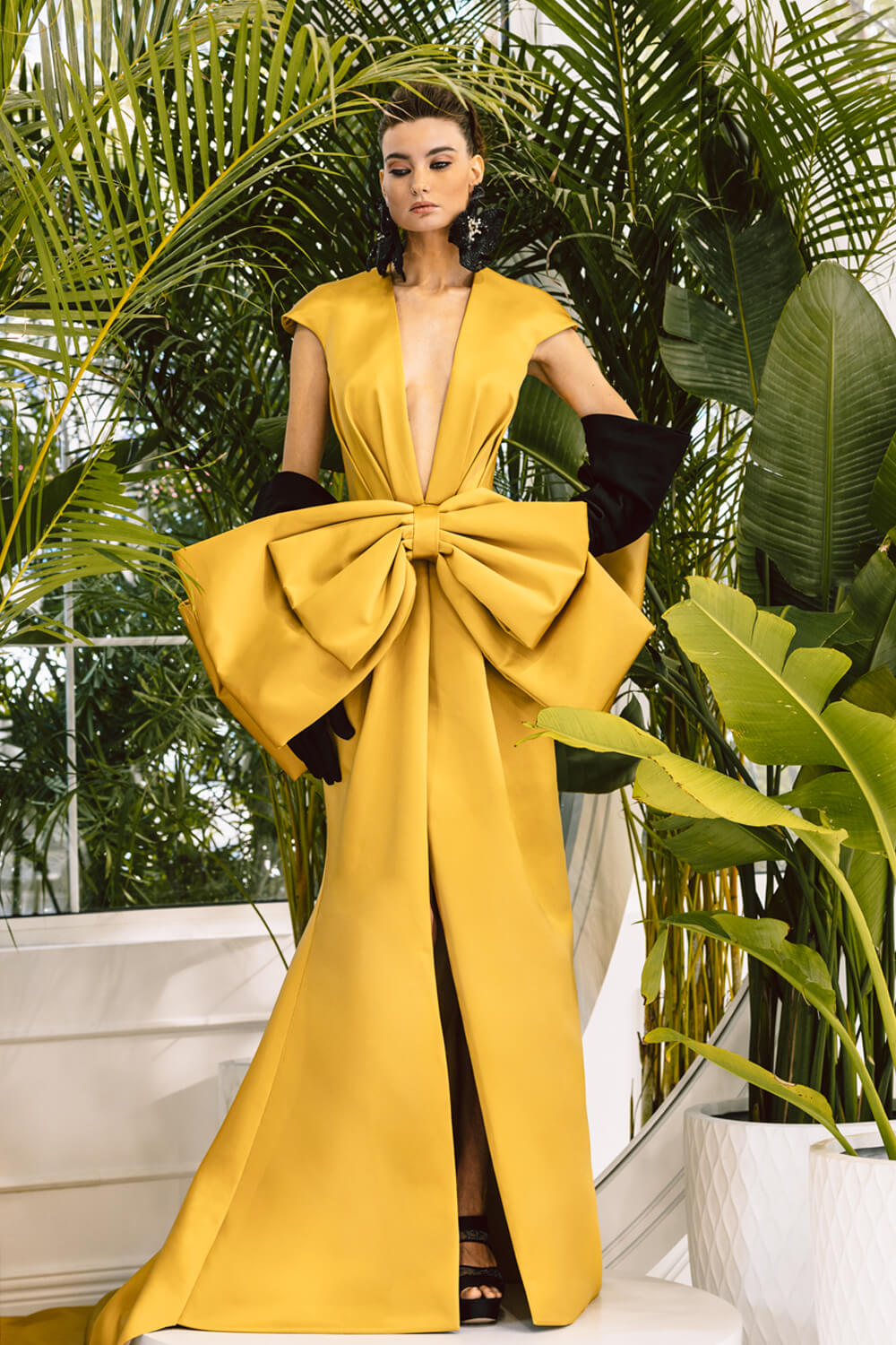 Golden satin drapes gracefully, mirroring the shifting dunes with a bold sculptural bow at the waist. A deep neckline and high slit add modern allure, while black gloves contrast elegantly. The flowing silhouette and intricate details echo the artistry of Desert Sadu, blending tradition with contemporary sophistication.