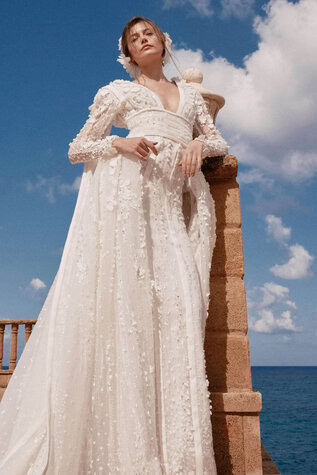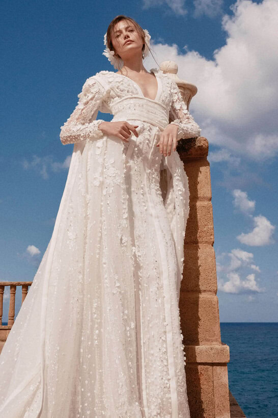 The Amanda dress exudes royal elegance with its plunging neckline and strategic cuts. Beaded tulle with 3D guipure flowers and structured crepe stripes enhance its silhouette. A detachable cape adds a majestic touch, completing this refined gown.