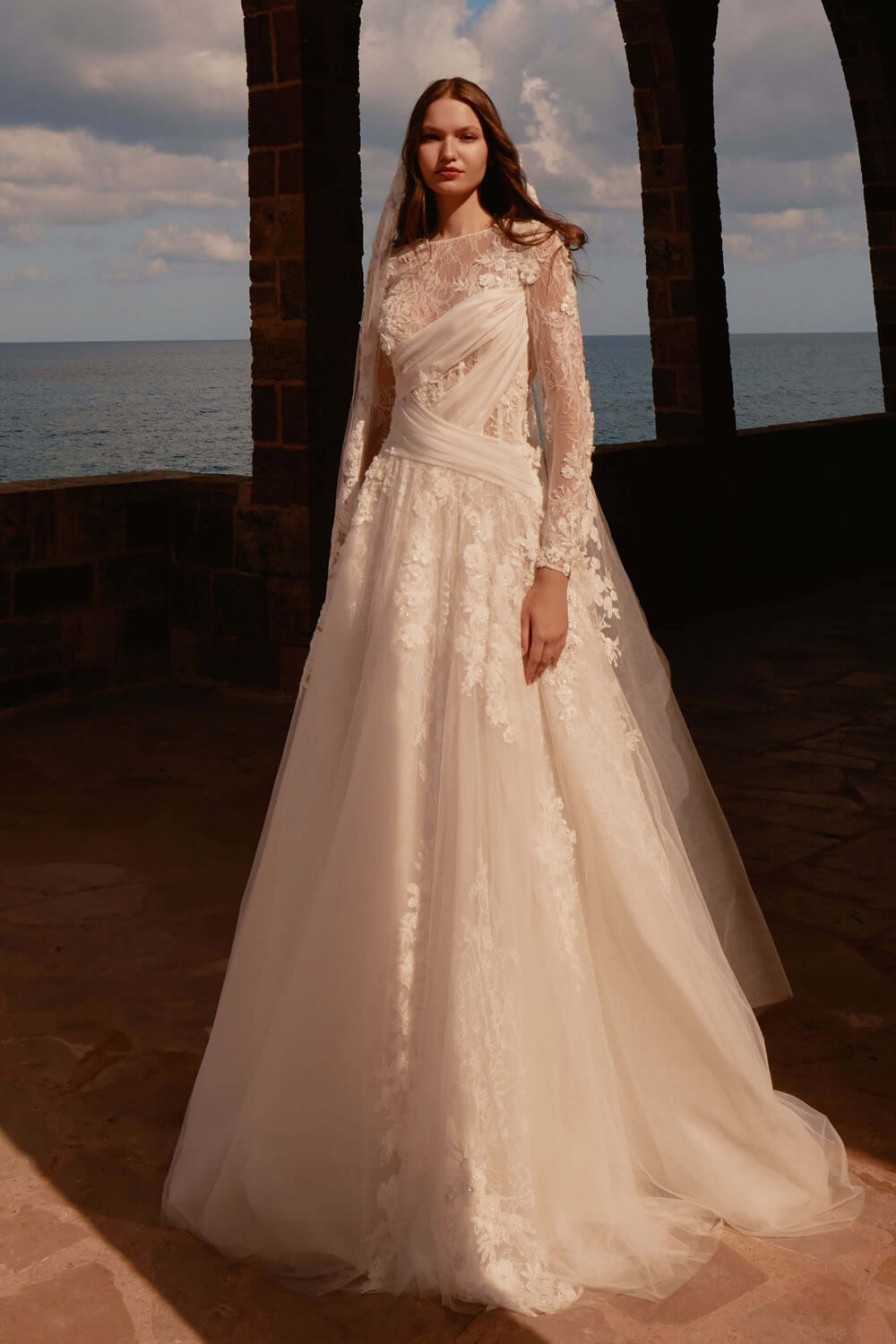 The Angelie dress features a high neck and long sleeves in tulle, adorned with Chantilly lace and beaded motifs. The artfully draped organza adds a unique, sophisticated touch to this elegant gown.