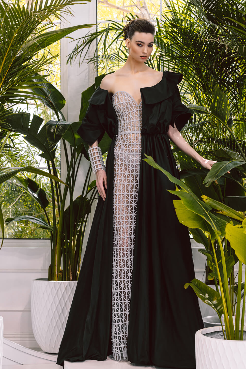 A striking fusion of heritage and modernity, this gown draws inspiration from Desert Sadu, reflecting its intricate geometric artistry. The structured lattice bodice contrasts beautifully with the flowing silhouette, embodying strength and grace. A statement of timeless elegance, this design captures the essence of tradition reimagined.