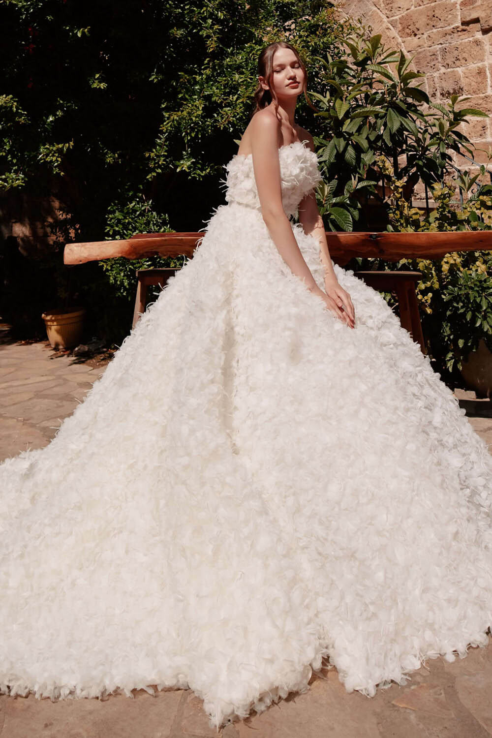 The Aurelie dress is a whimsical, strapless gown adorned with 3D flowers and delicate feathers for a dreamy, ethereal look. The fluffy skirt adds volume and movement, while a transparent belt enhances the waist with modern elegance. Perfect for a bride seeking a unique and enchanting style.