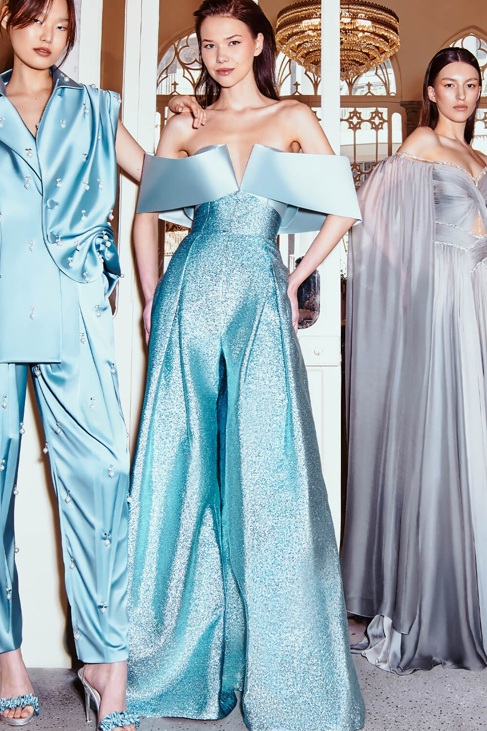 When elegance meets comfort! Choose Betty, an off-the-shoulder neckline evening outfit with full blue glitter for a touch of spark and sophistication.