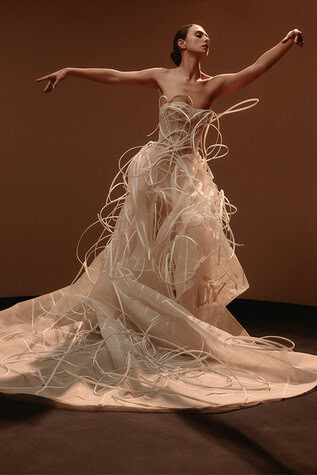 A sculpted corseted bodice flows into airy tulle, wrapped in 3D looped ribbons that create movement and artistic texture.