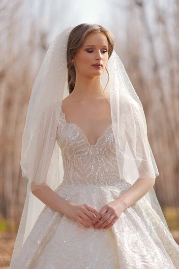 A fully beaded and sequined bridal dress with a plunge sweetheart neckline and thick straps. Cavin features a tight corset bodice with delicate lace embroidered with beaming crystals, then cascades gracefully in a voluminous blush skirt with beaded patterns, similar to the ones on the bodice.