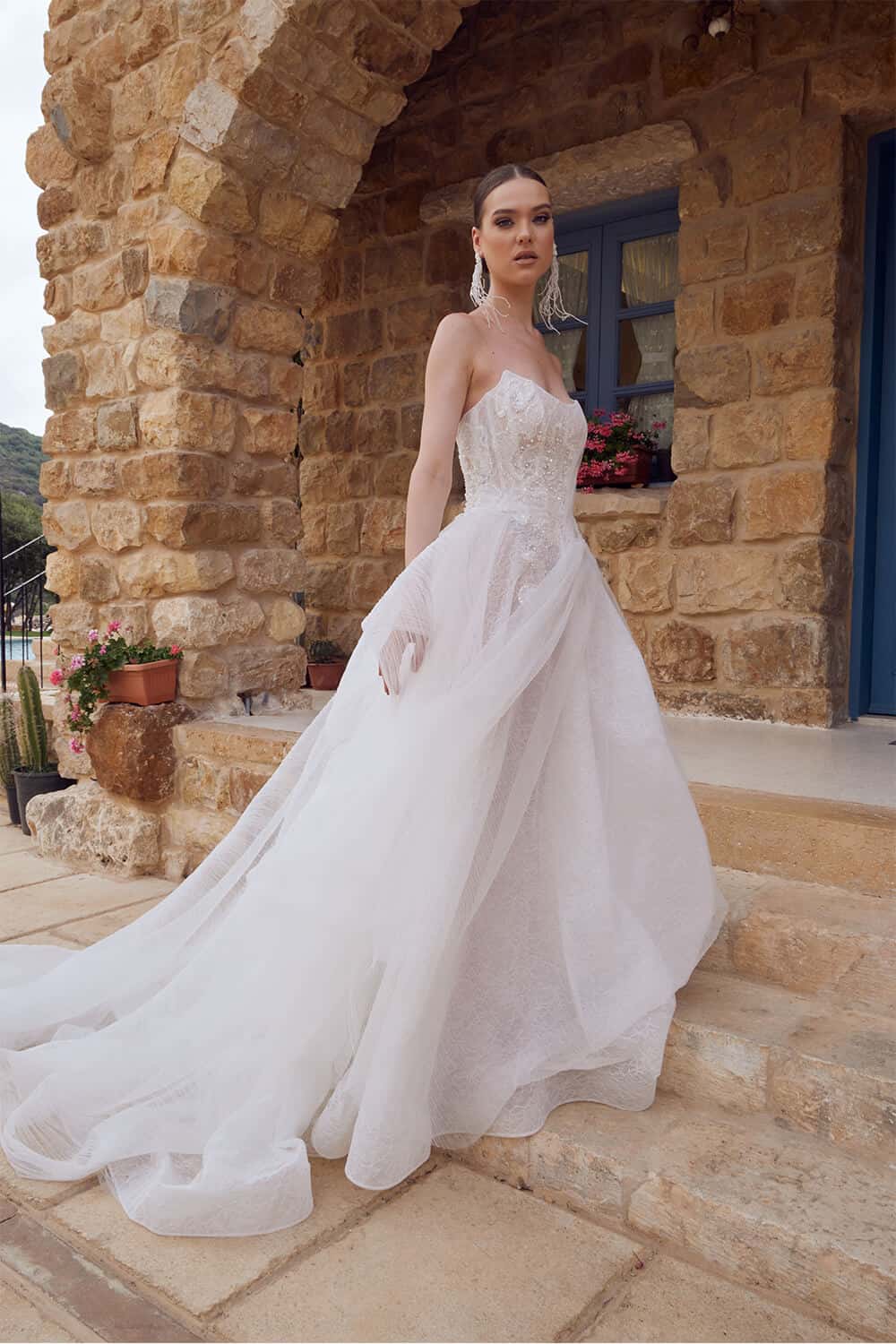 Cobalt is a unique strapless wedding dress with a curved neckline and a lace bodice fully hand-beaded with shining crystals and a beads. The skirt is layers with lace and tulle for a romantic yet modern overall look! This gown is the perfect option for a bride who’s looking to showcase her personality on her big day!