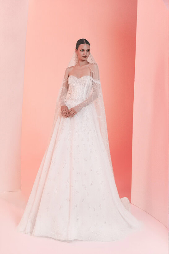 This romantic ball gown features a corset-style bodice with a soft sweetheart neckline and sheer off-the-shoulder sleeves. Embellished with delicate beading throughout, the gown is designed in layers of airy tulle that flow into a graceful train. A matching embroidered veil adds a poetic finishing touch.