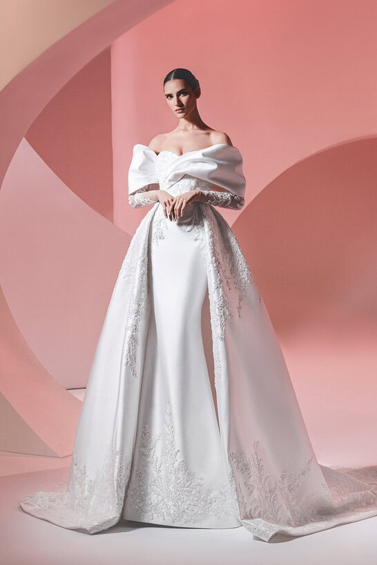 A sleek column gown with dramatic oversized sleeves that fall off the shoulders in voluminous satin folds. Intricate embroidery graces the bodice and hem, while a detachable overskirt adds volume and movement. A contemporary statement of regal elegance.
