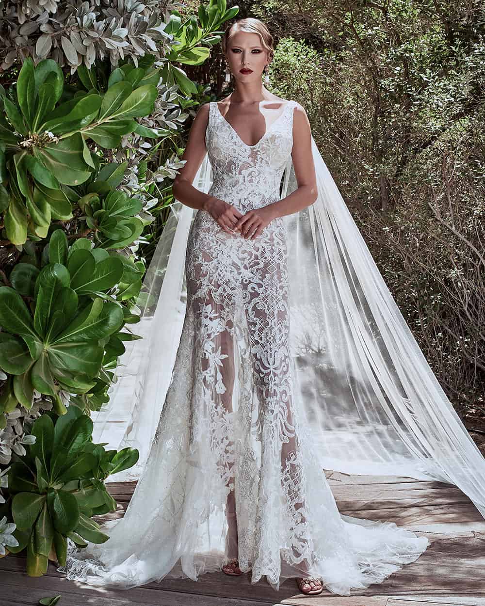 Hans is a mermaid gown with an alluring plunging V-neckline and an open back, rich in intrigued lace and embroidery designed with the finest touches and style. This intriguing dress gives you the best of both worlds with its simple cut and delicate details.