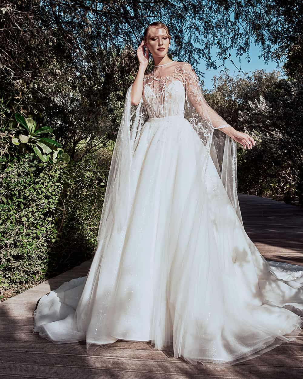 A sophisticated ball gown wedding dress, paired with a handmade embroidered cape, made of shimmery material and bedazzled with thousands of crystal beads. Its thin irregular belt ties the look together and highlights the waist in a defined manner.