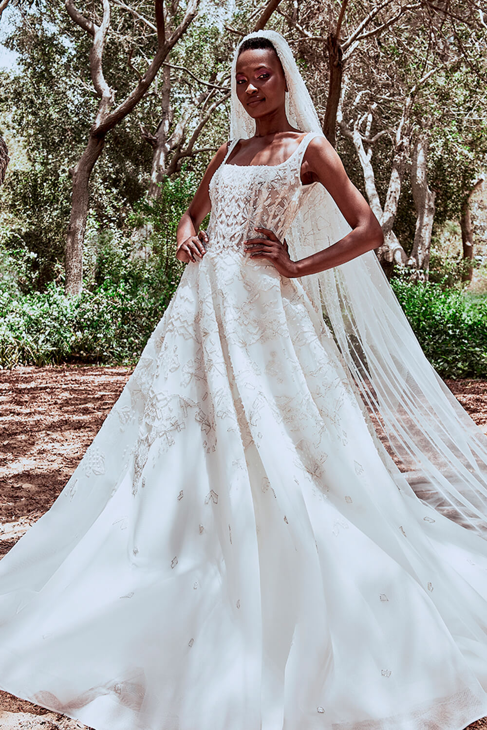 Howard is an embellished A-line gown with a squared neckline and a tight see-through corset. This gown is fully bedazzled with silver beads and white pearls.