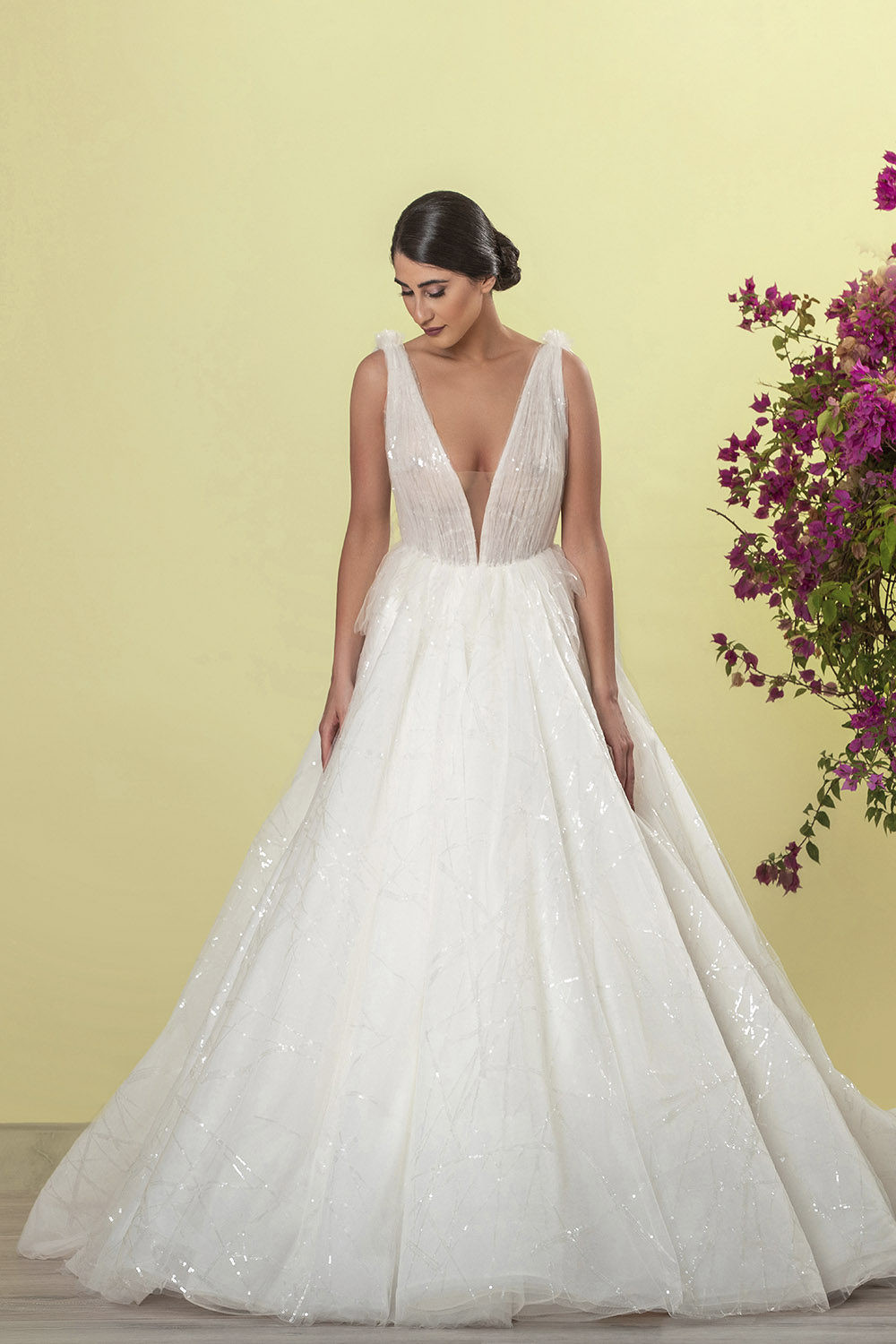 A soft A-line wedding gown with a deep V neckline, soft shine lines, and a sweet cape train.