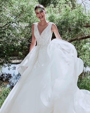 An A-line dress with intricate lace details on the bodice and a very modern and pleated back overskirt with spread embroidery.
