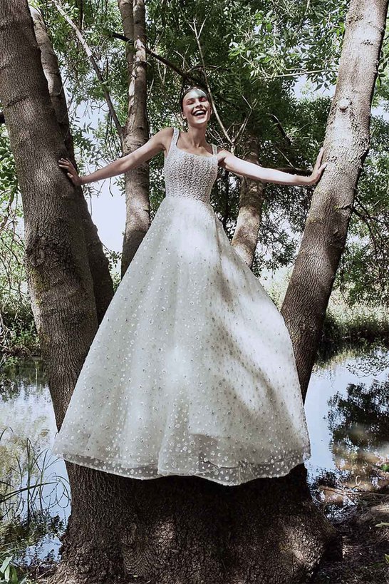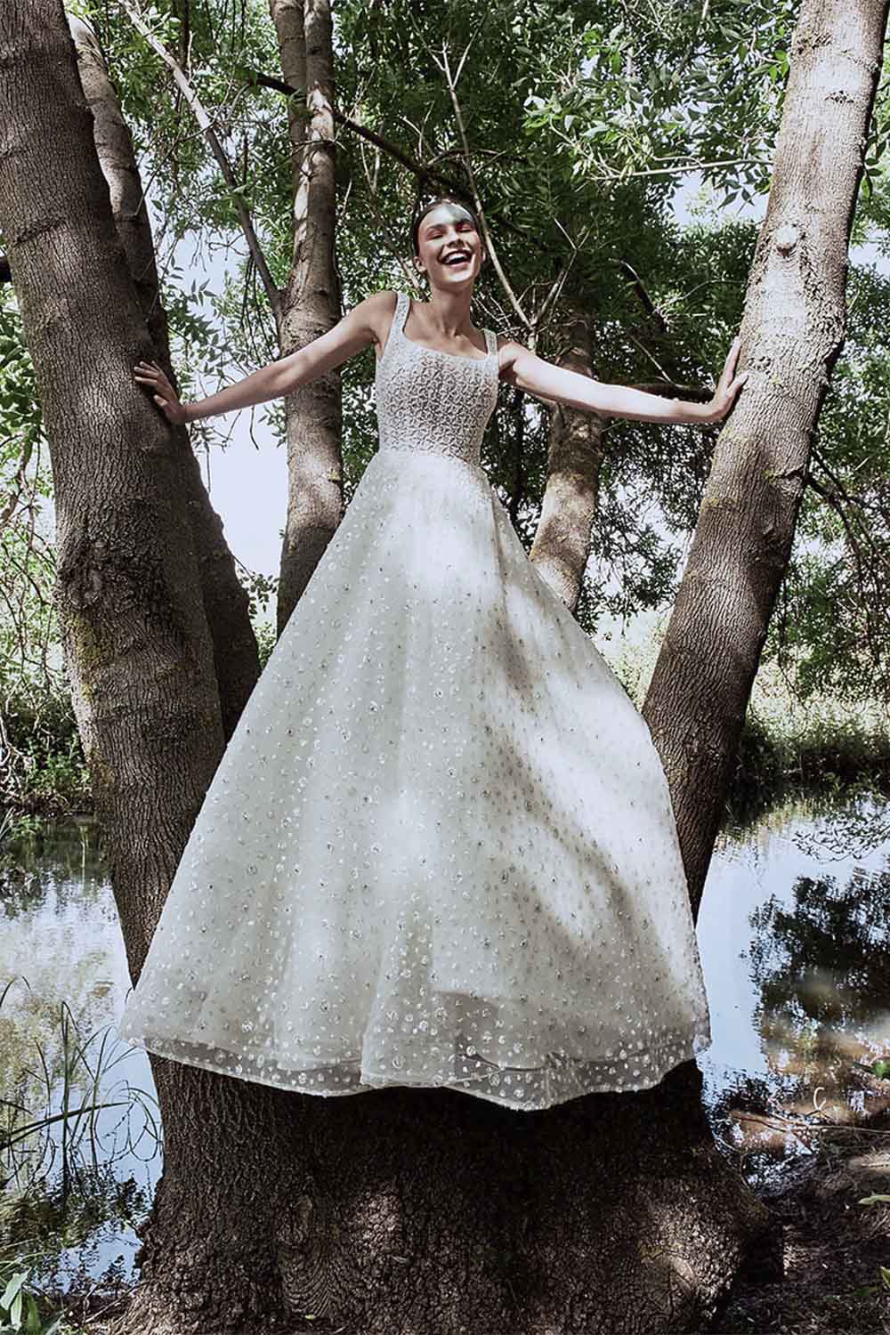 Karter is an A-line wedding dress, covered in beaded embroidery and handmade bodice. Its square neckline and its low open back gives this dress a touch of glamour.