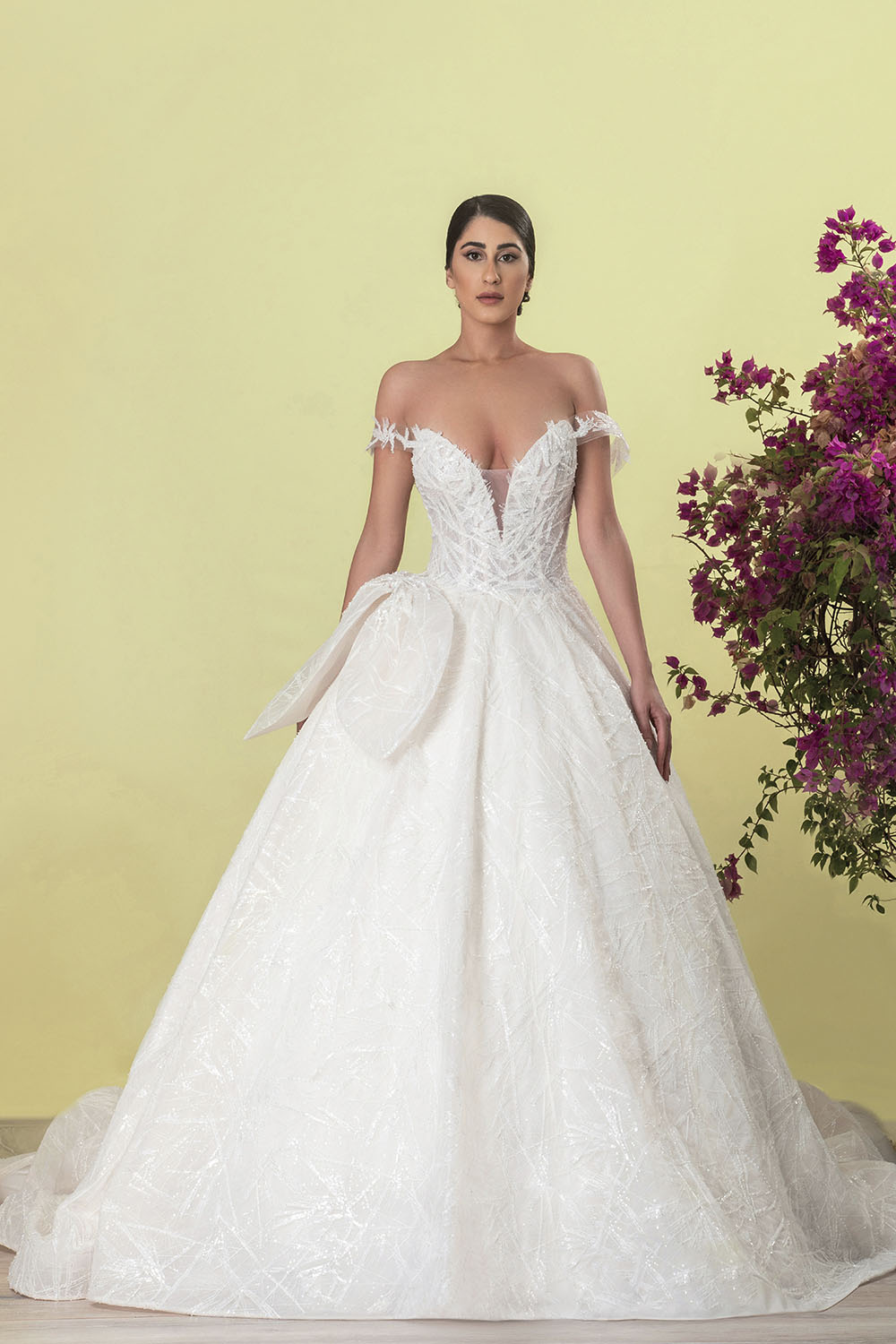 Featuring an A-line silhouette and a flattering V neckline, this bridal gown is elevated by a charming one-shoulder bow, adding a touch of sweetness and glamour to the entire look.
