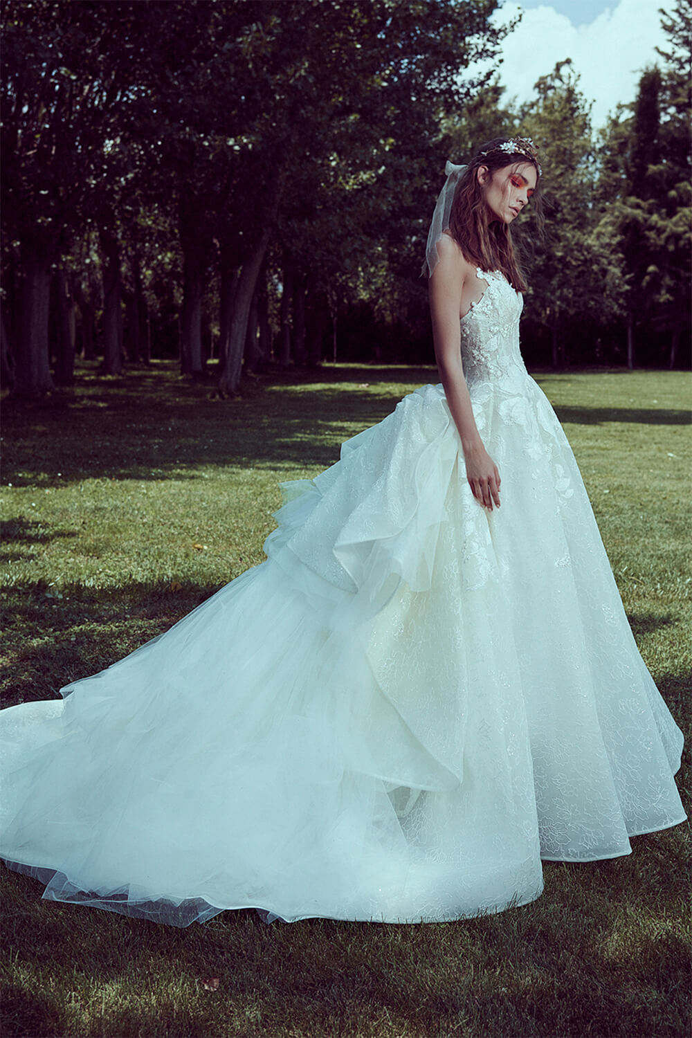 A-line ball gown embellished with fine embroidered lace for a soft luxurious look. The surprise effect is reserved for the back of the dress where a big bow, a ruffled tulle, and a deep open back, bring volume and sensuality.